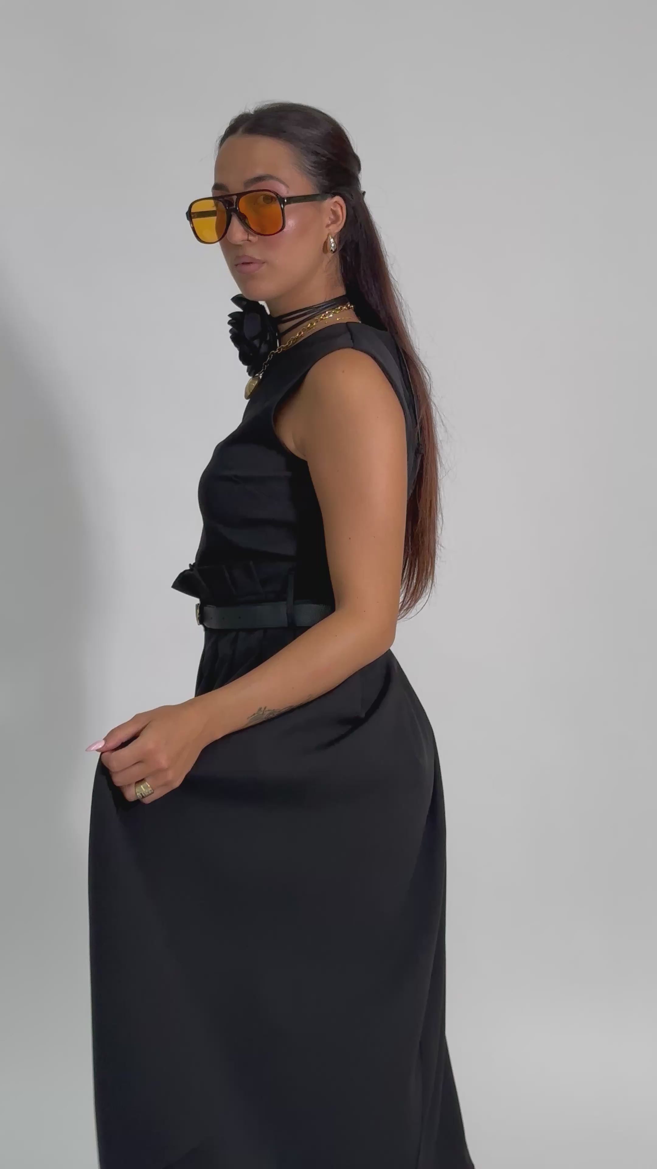 Abito smanicato modello impero con dettaglio plissè sul punto vita, parte inferiore ampia con pences, tasche e cintura inclusa. Chiusura a zip posteriore.