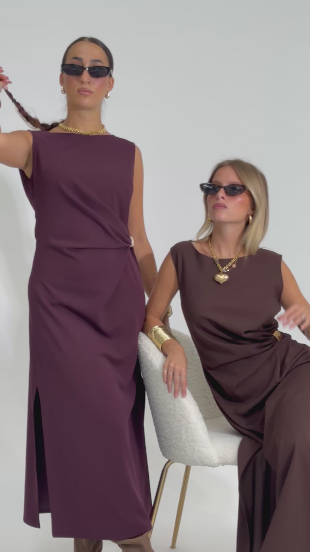 Abito smanicato con drappeggio e spacchetti laterali.