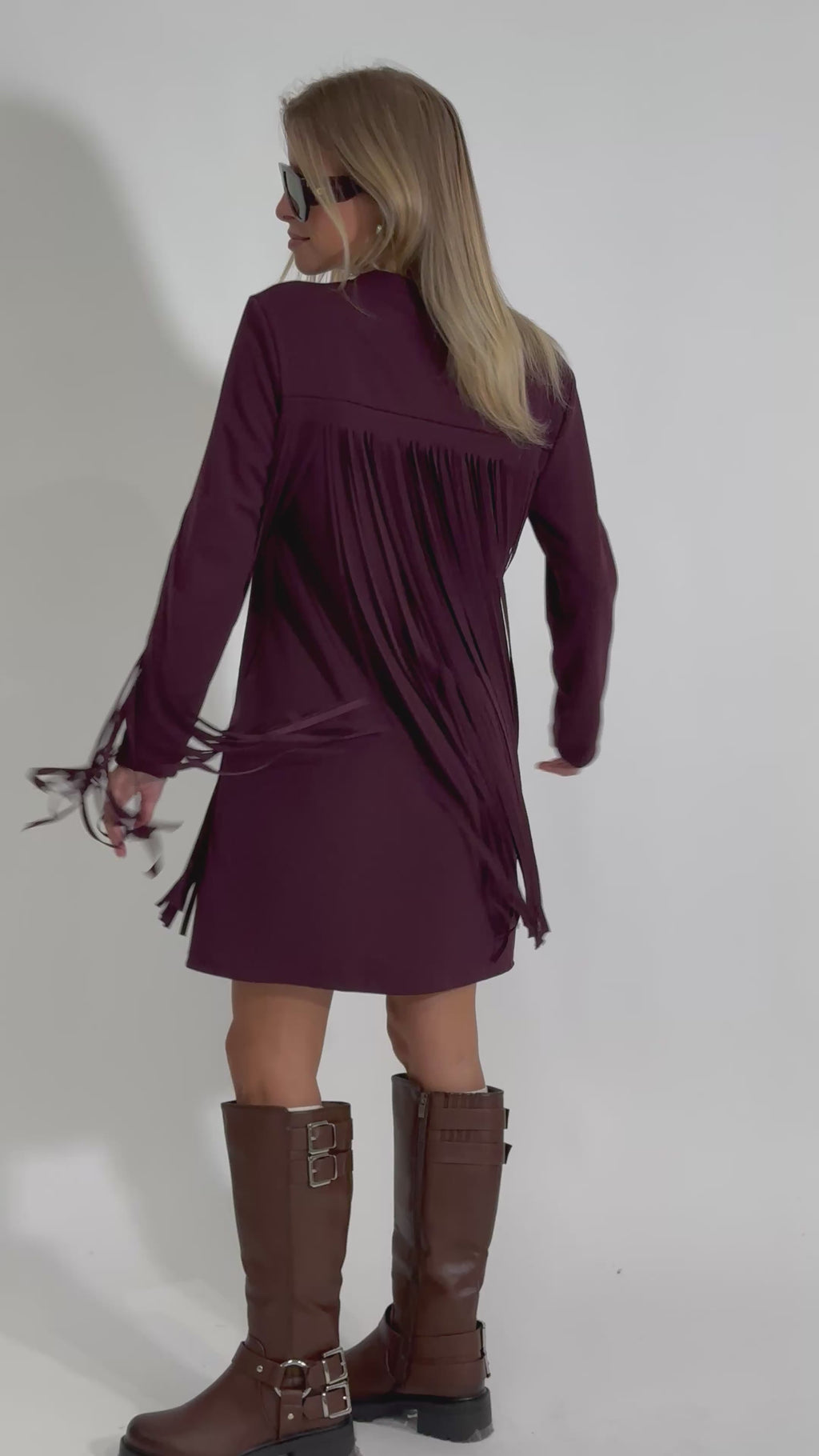 Abito dal taglio dritto a manica lunga con frange anteriori e posteriori.