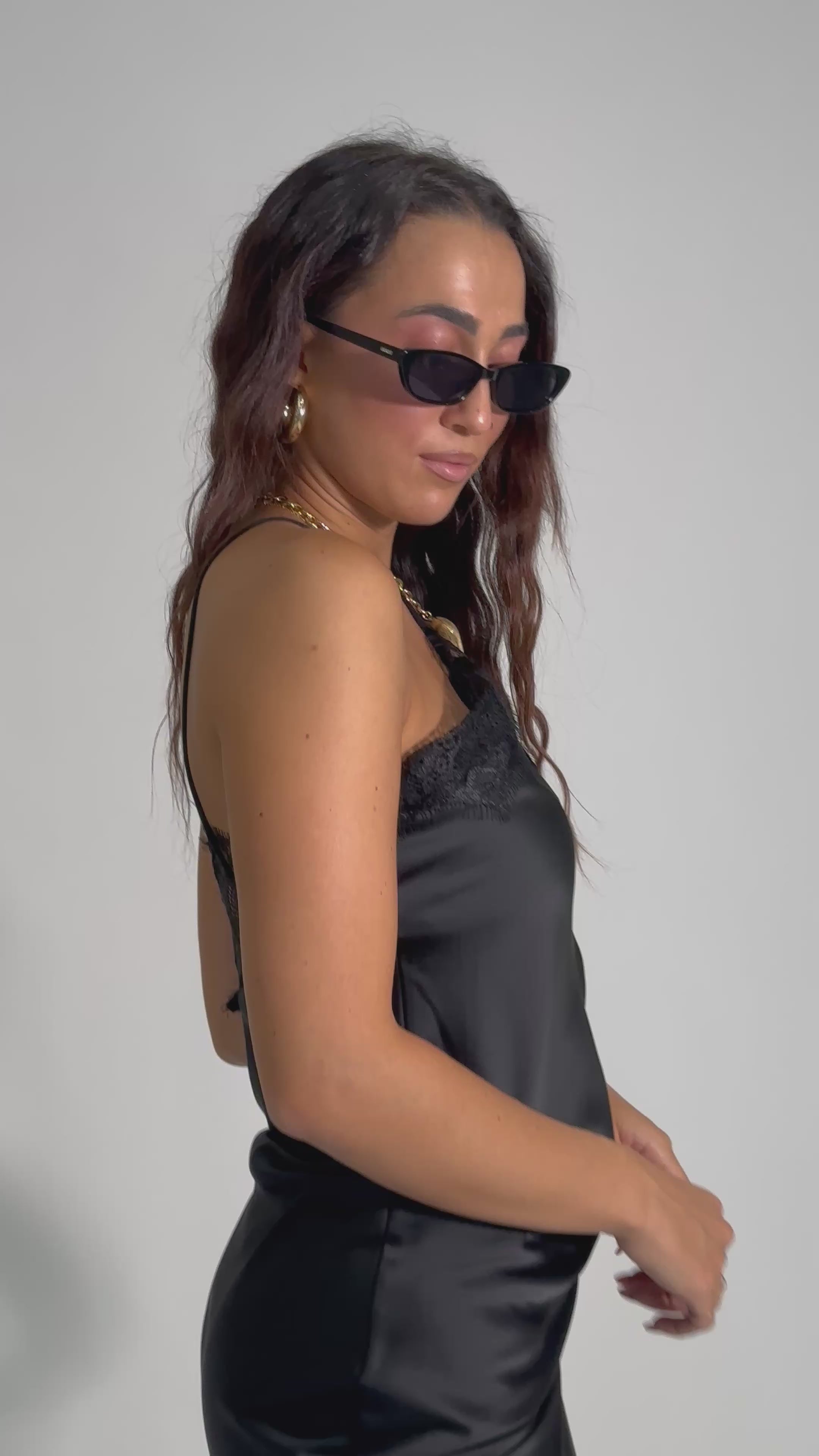 Abito in satin asimmetrico con spalline a coda incrociate e profili in pizzo.