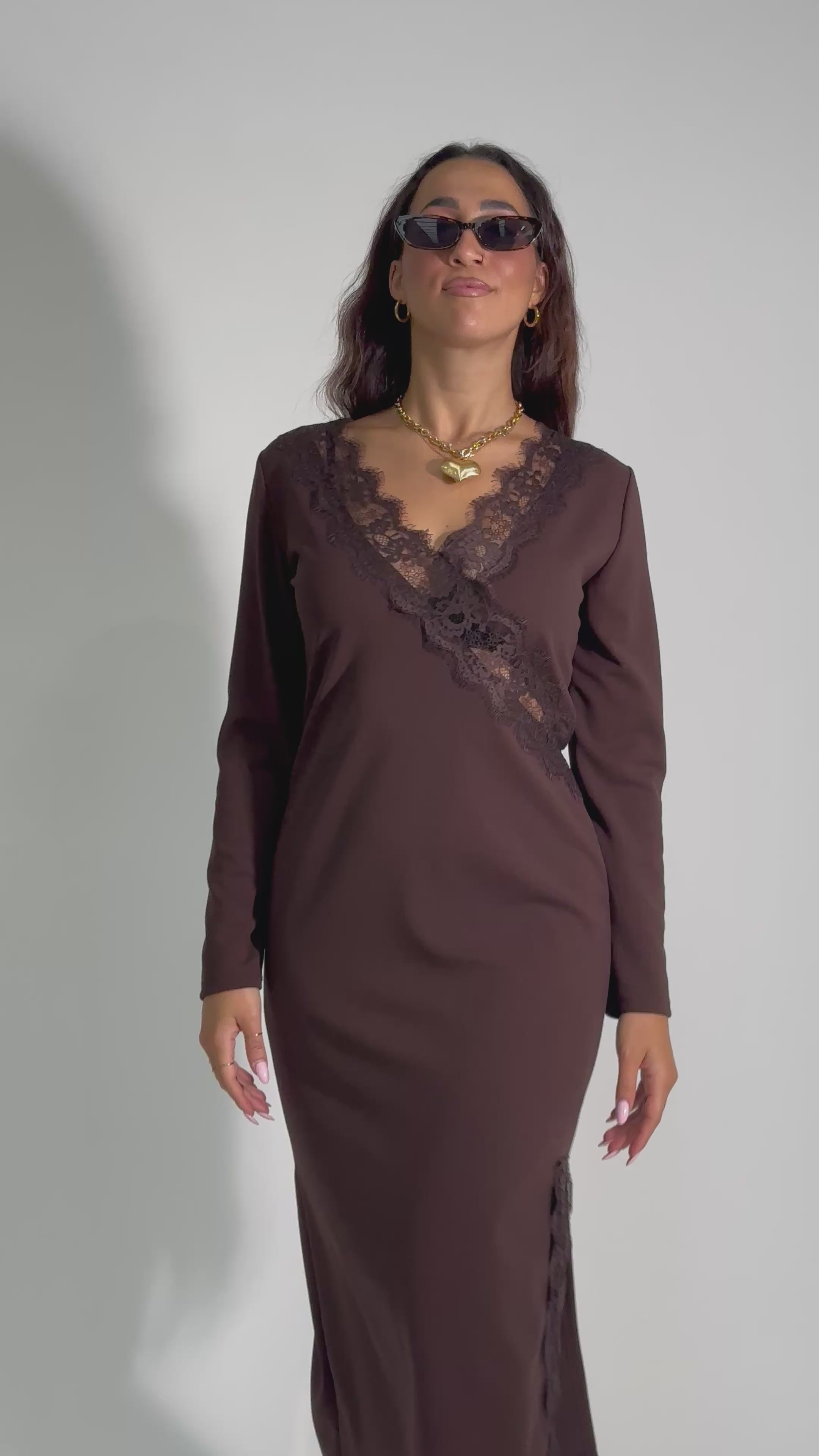 Abito in crepe elasticizzato con scollo a V, spacco laterale e pizzo.