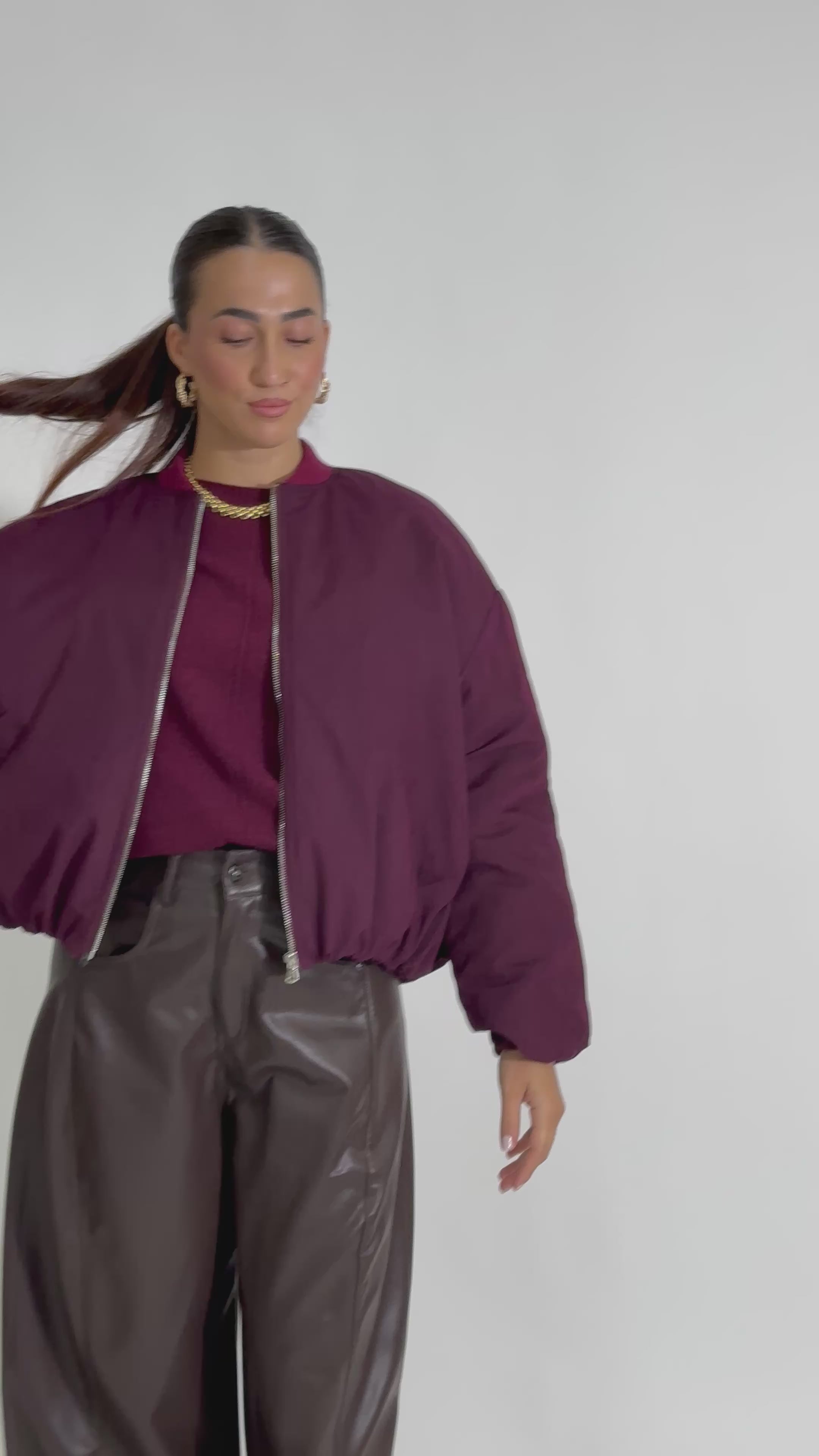 Giacca bomber leggermente corto con arricciatura sul fondo, interno trapuntato, colletto in maglia, chiusura a zip e tasche laterali.