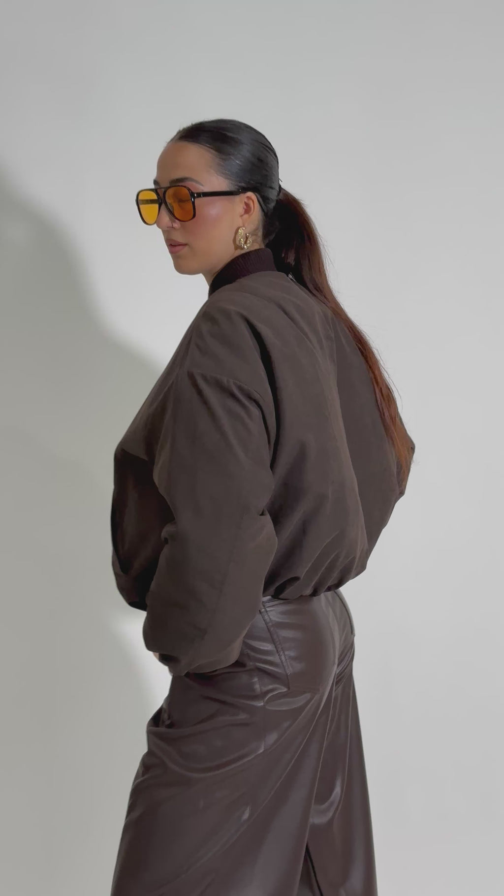 Giacca bomber leggermente corto con arricciatura sul fondo, interno trapuntato, colletto in maglia, chiusura a zip e tasche laterali.