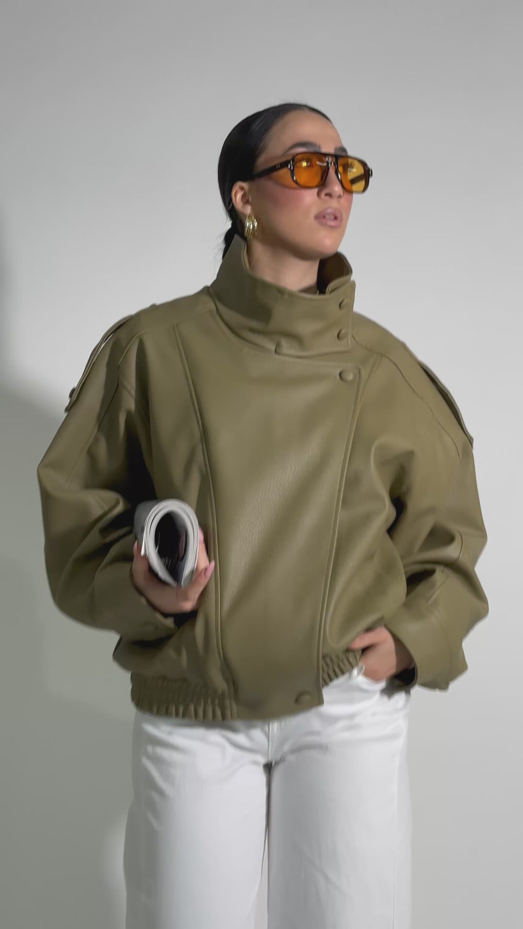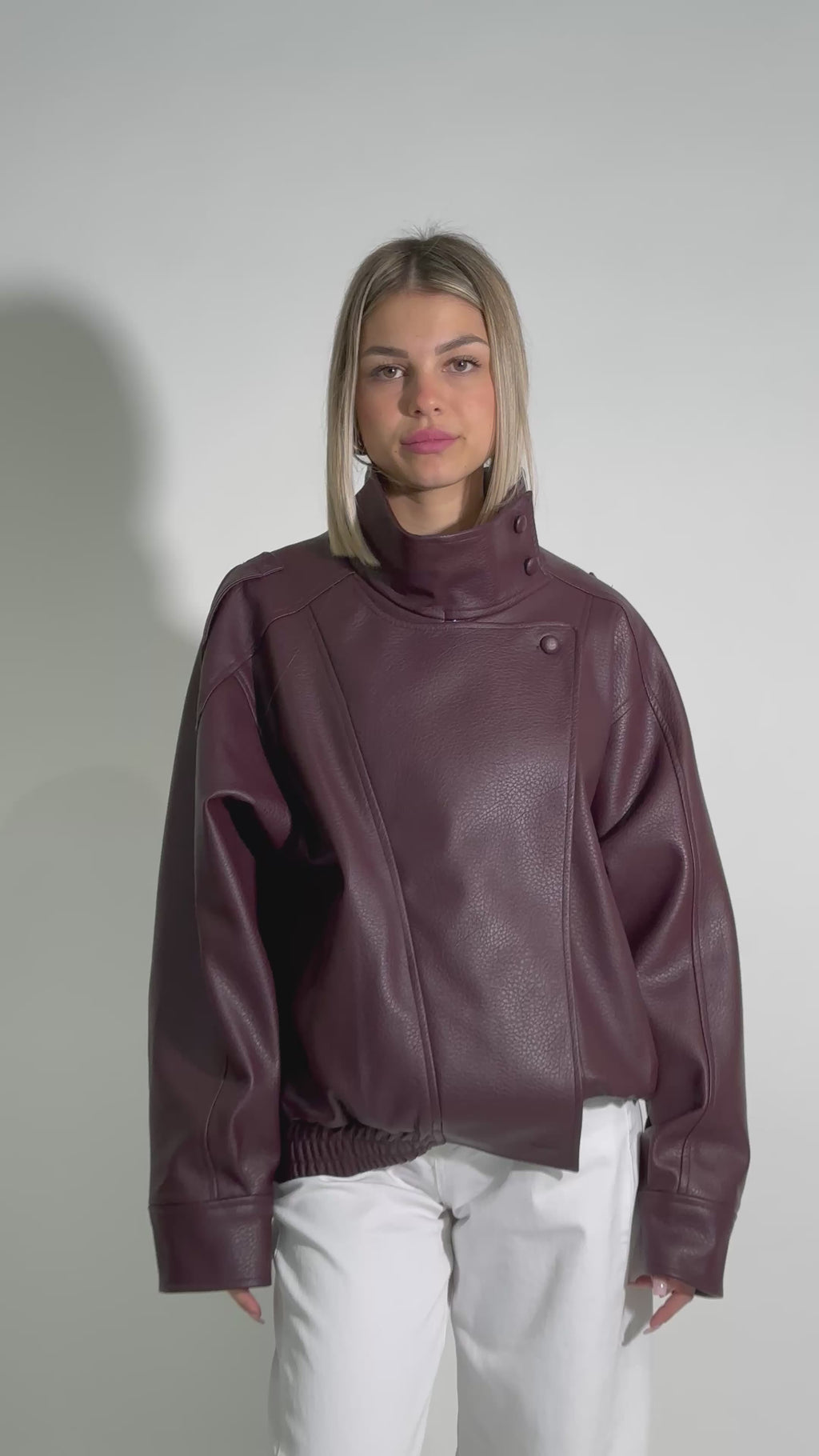 Giacca modello bomber foderata in eco pelle martellata con chiusura a zip, manica drappeggiata, tasche laterali e fondo ad elastico.