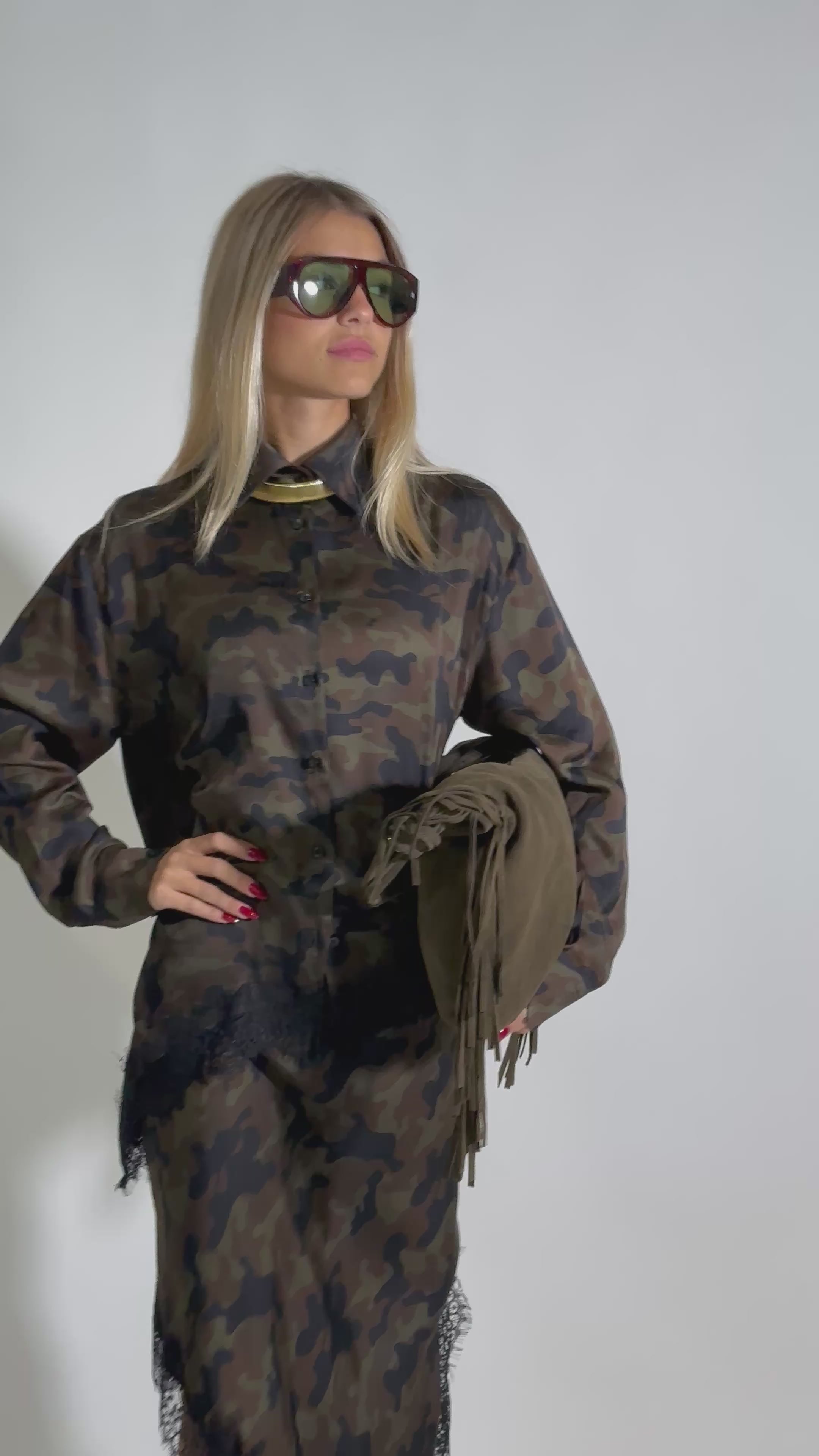Camicia asimmetrica dal taglio regular in satin con stampa camouflage e profilo in pizzo.