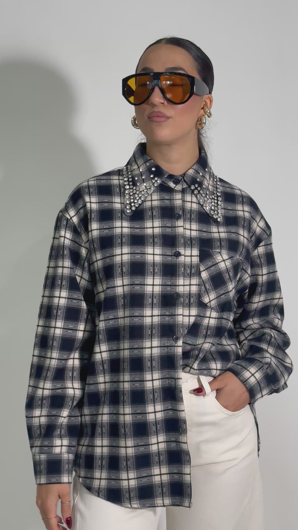 Camicia in madras super confortevole con collo a cristalli e fondo tondato.
