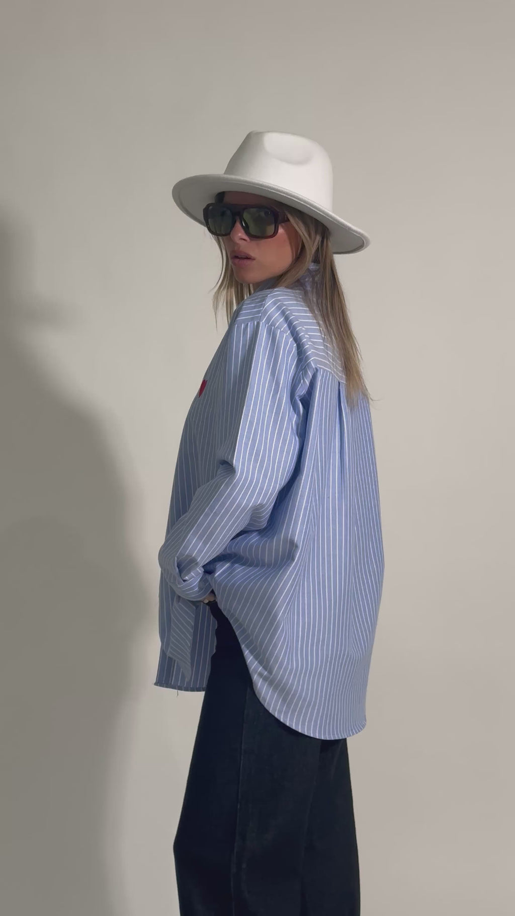 Camicia a righe in cotone con cuore rosso ricamato, vestibilità ampia.