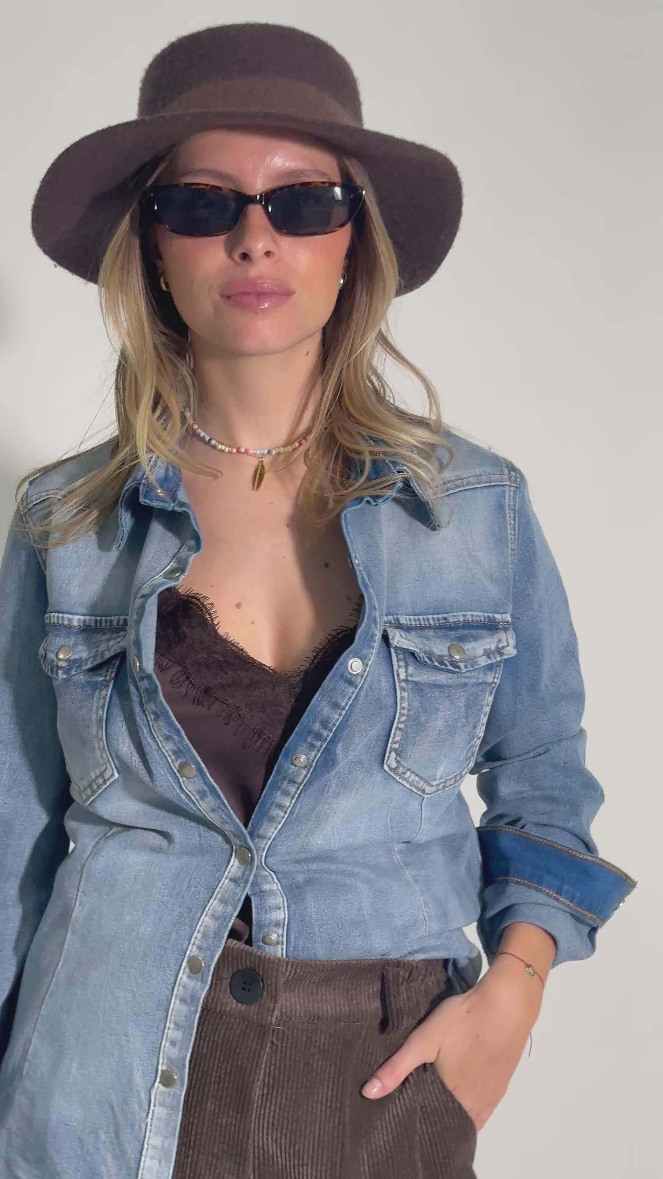Camicia in denim elasticizzata chiusura con bottoni a clip, vestibilità regular.