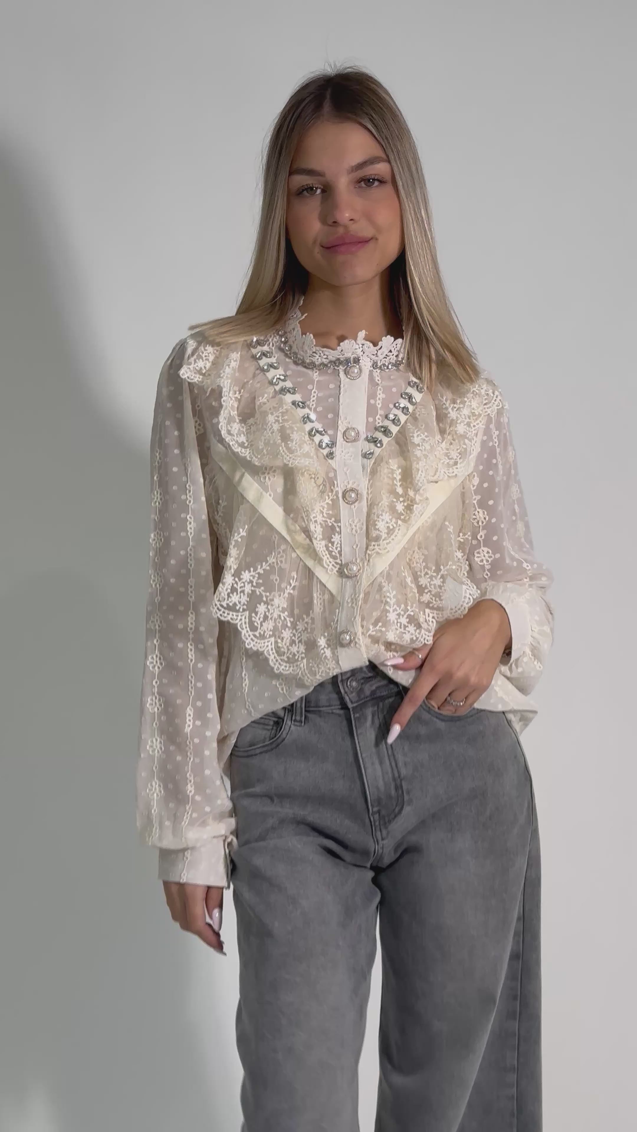 Camicia ricamata con rouge in pizzo, applicazioni strass e bottoni gioiello.