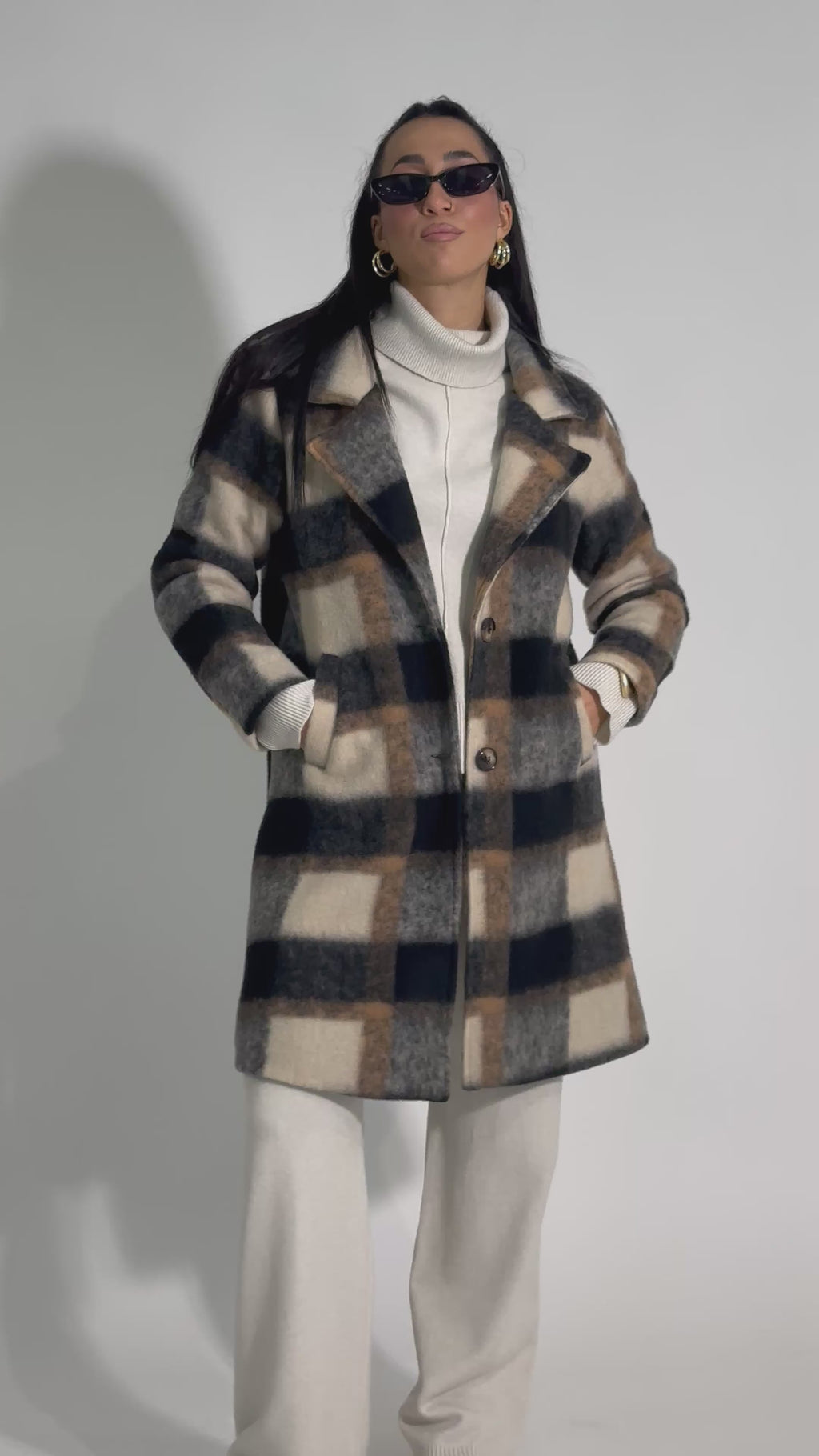 Cappotto muflon in lana cotta foderato, mono petto a fantasia con tasche laterali.