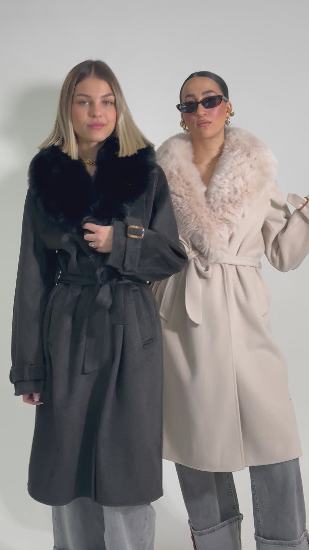 Cappotto taglio vivo con collo in ecopelliccia rimovibile, fusciacca, tasche laterali.