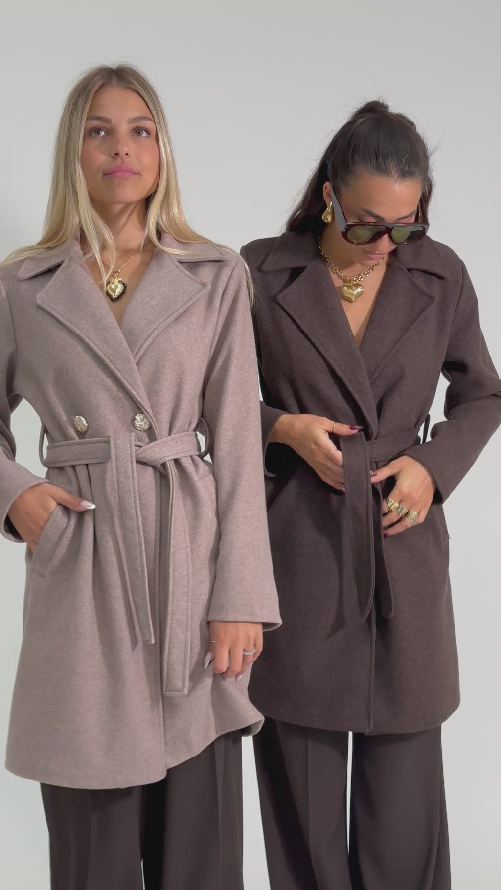 Cappottino foderato a doppio petto modello trench con bottoni a contrasto, spalline rinforzate, fusciacca e tasche laterali.