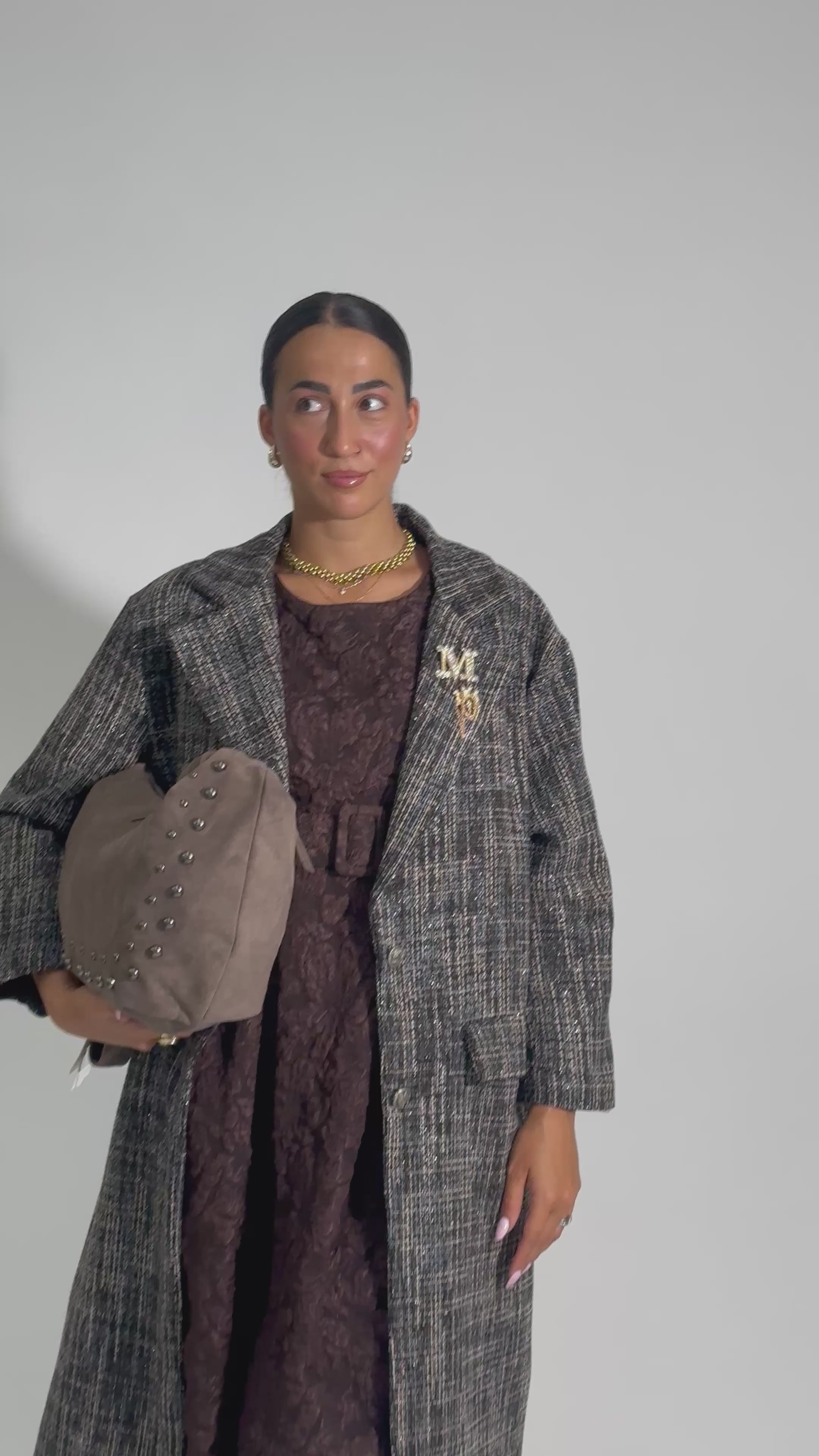 Cappottino dritto mono petto foderato in tweed con lurex, tasche a patta e spille removibili.