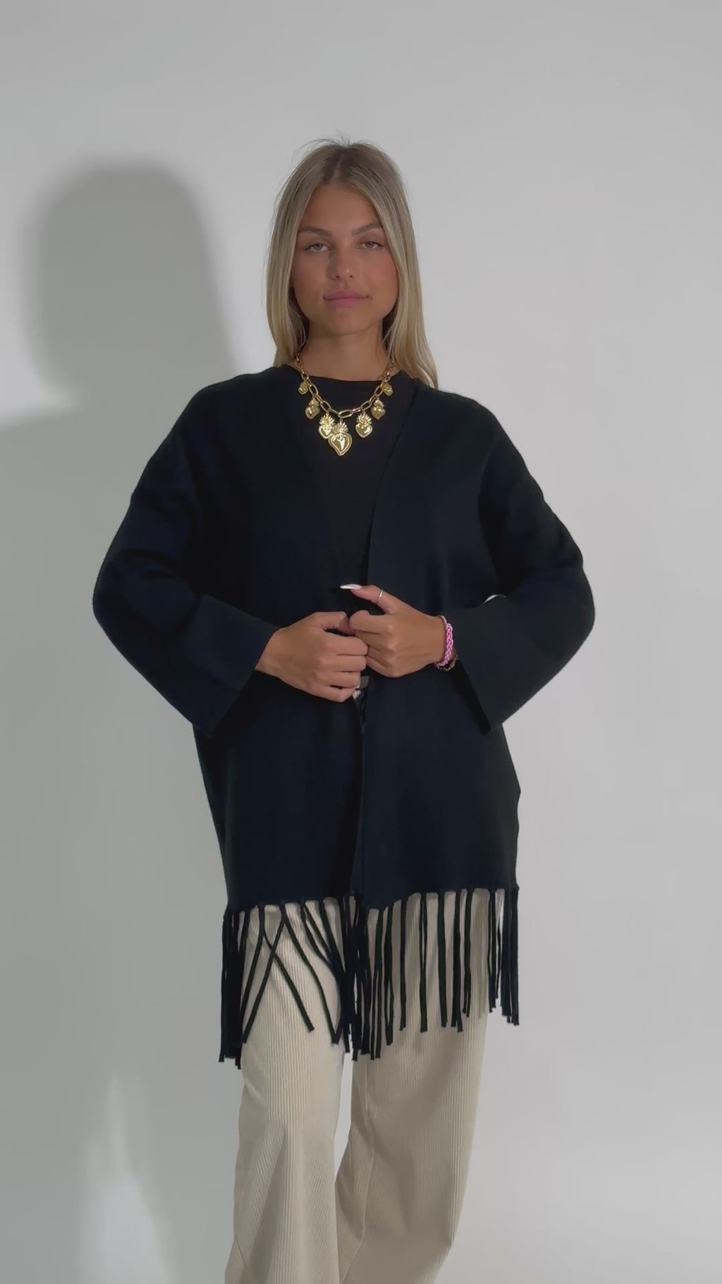 Cardigan/maglia in misto viscosa, modello aperto con dettaglio frange sul fondo.