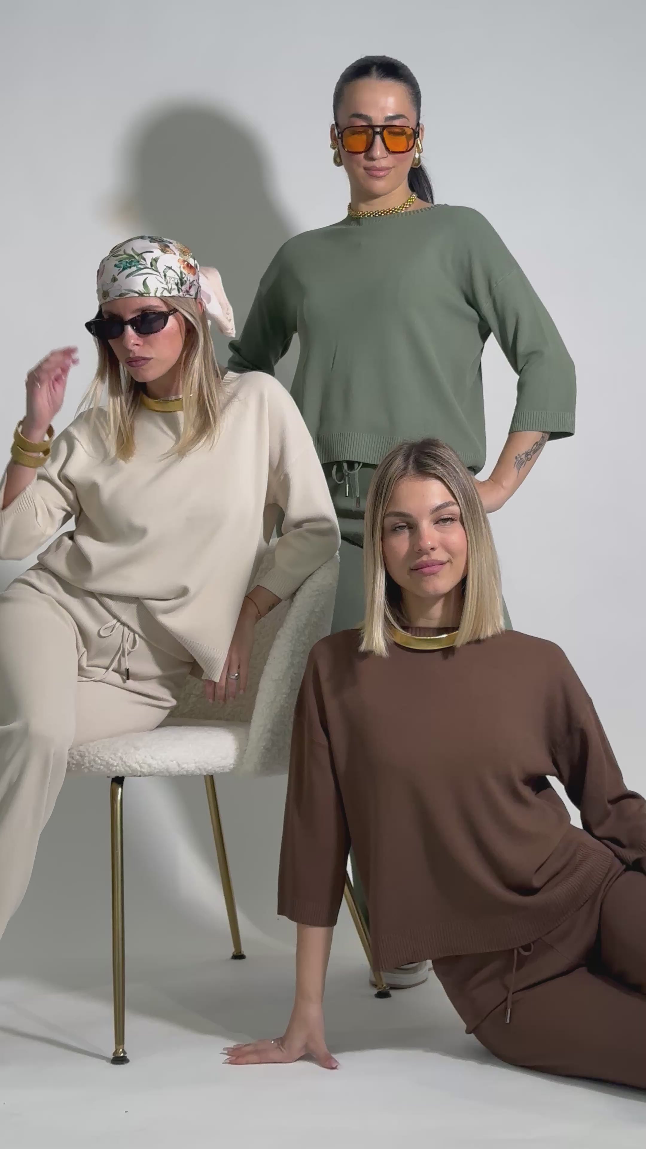 Completo coordinato in misto viscosa composto da maglia con manica a 3/4 e pantalone con elastico in vita a taglio dritto.