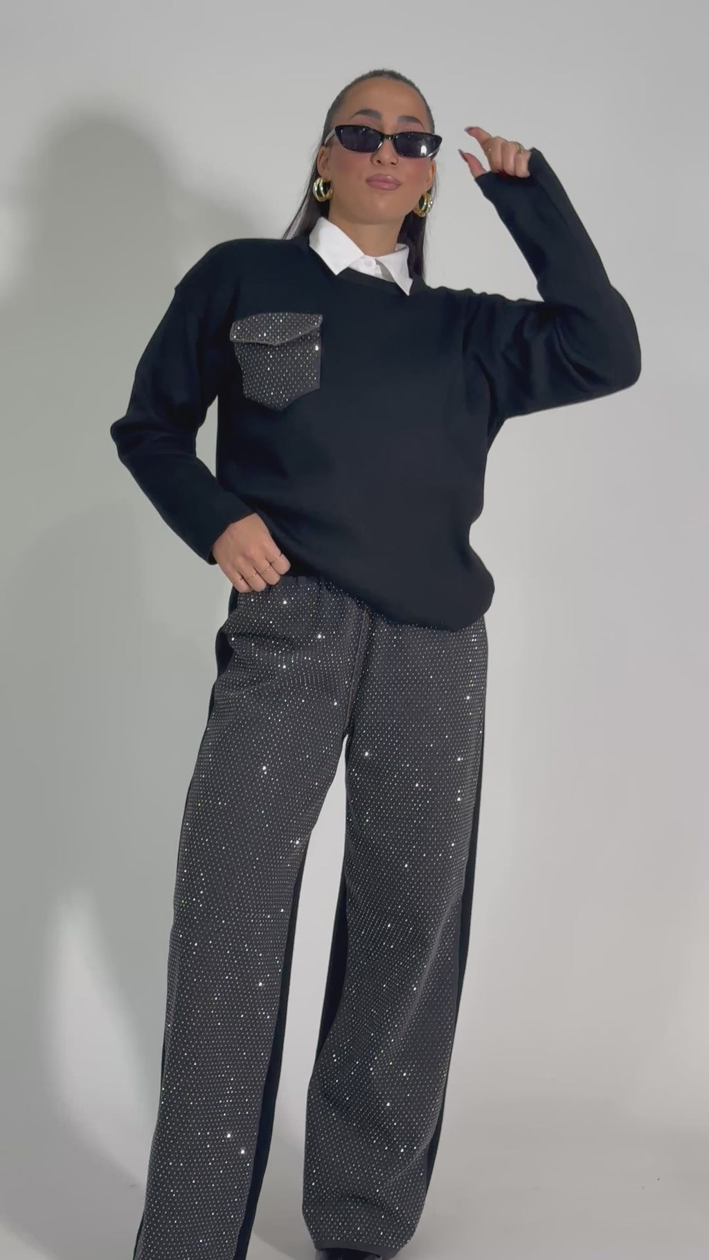 maglia a giro collo dal taglio dritto con tasca a contrasto in micro borchie
