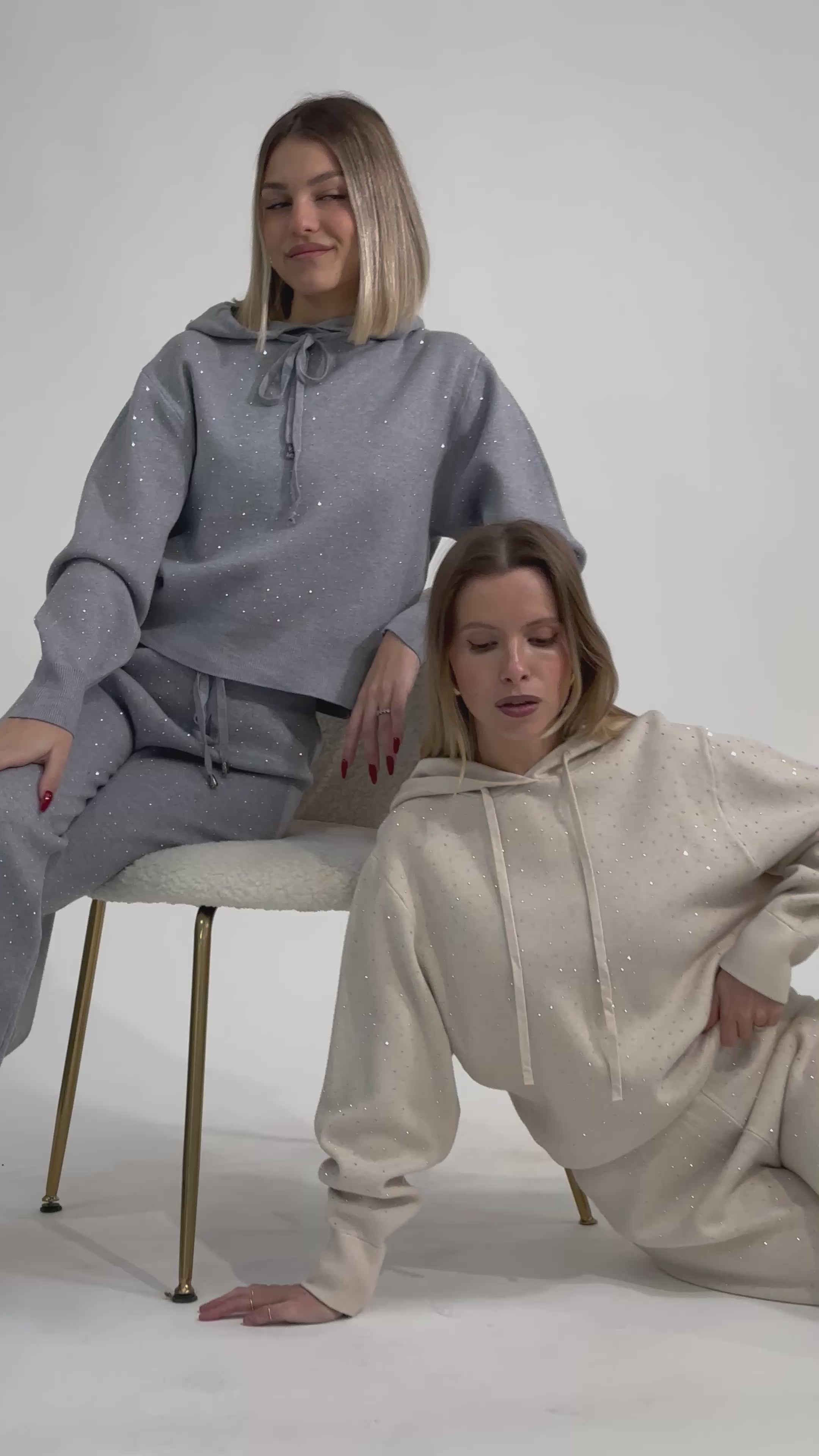 Completo in maglia cosparso di strass composto da maglia con cappuccio pantalone a palazzo con vita elastica e culisse.