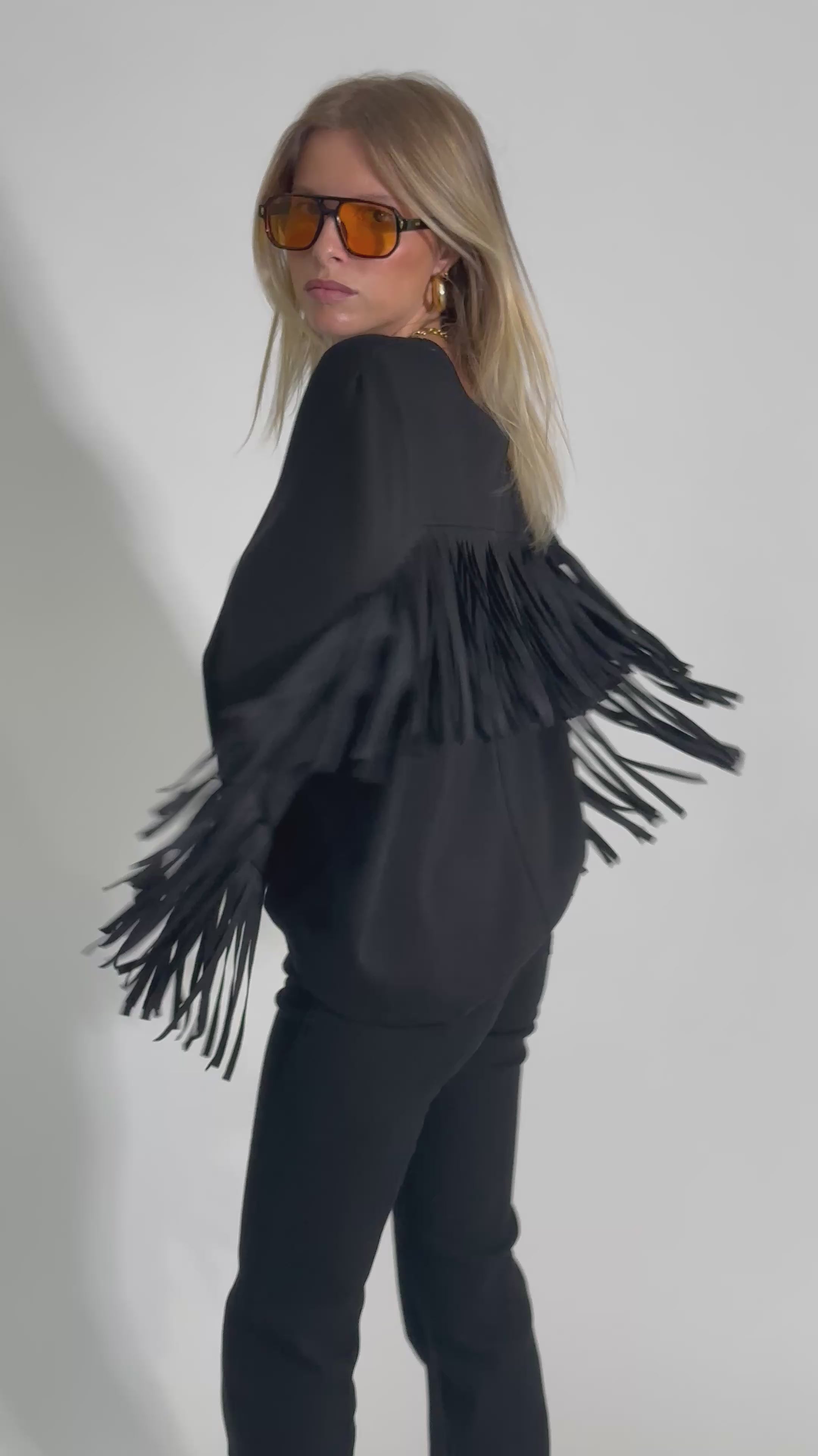 Felpa sgarzata in misto viscosa dal taglio dritto con dettaglio frange posteriori.