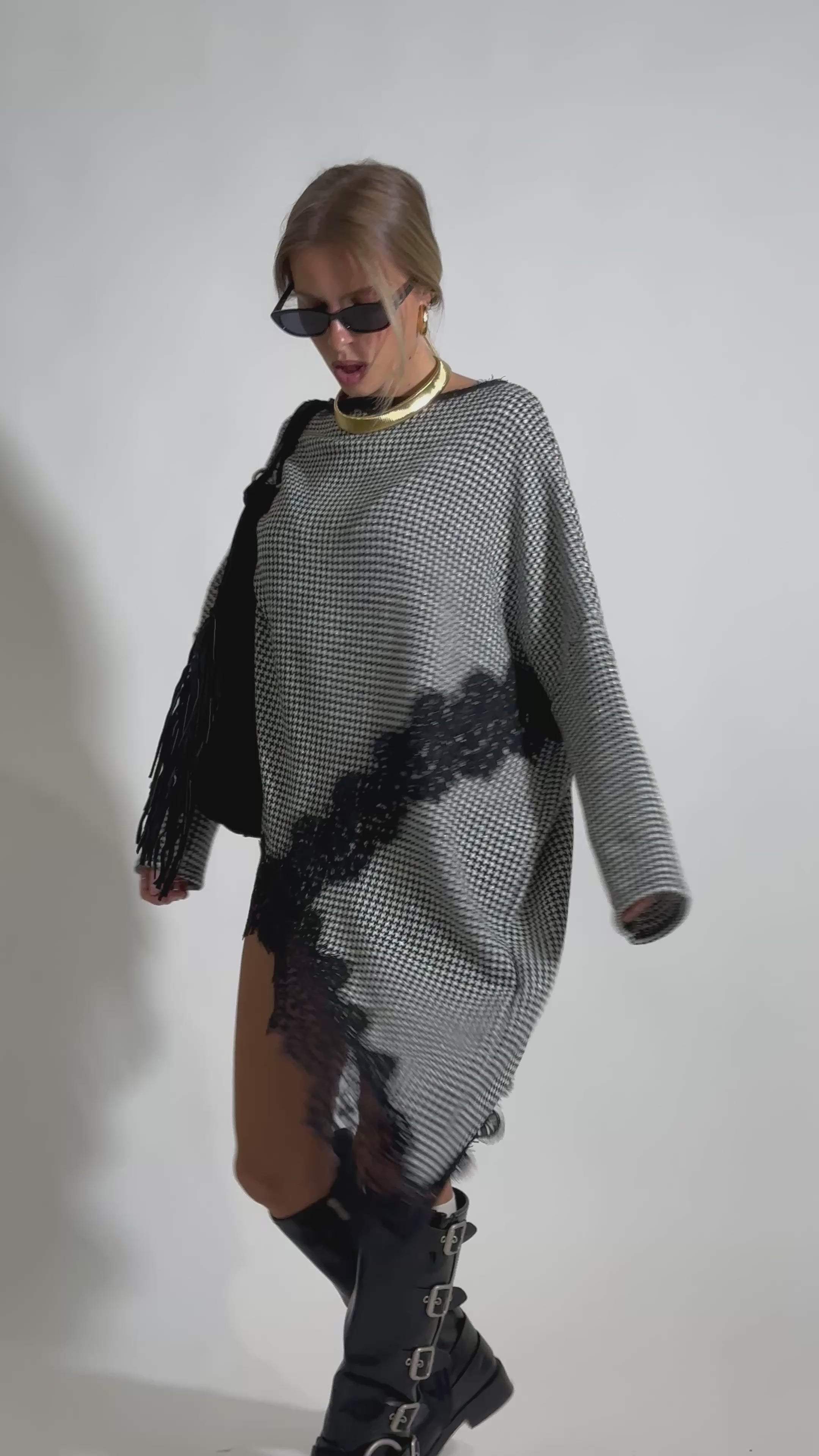 Felpa in pied de poule con filo di lurex con inserti in pizzo e taglio asimmetrico.