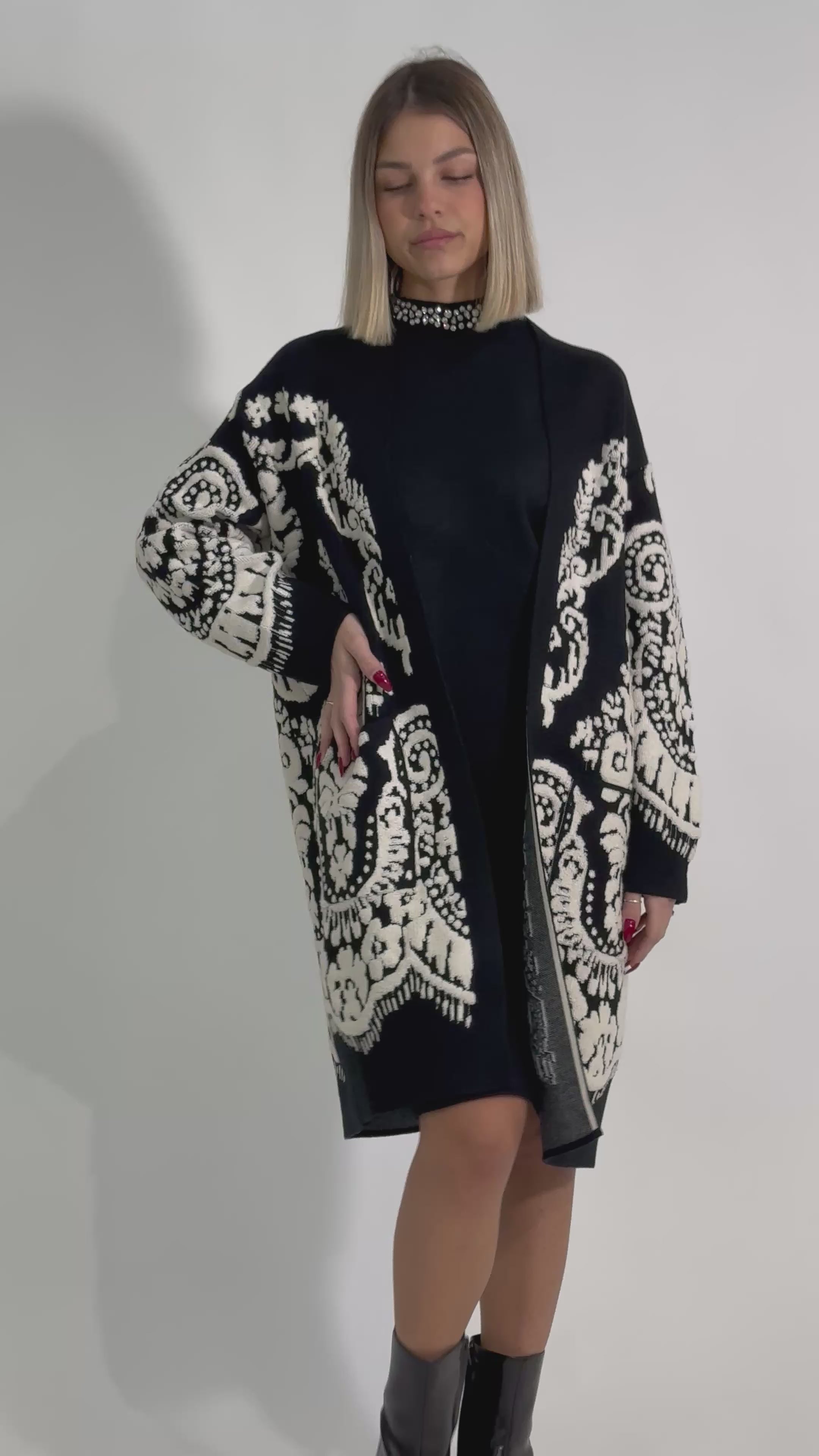 Maxi giacca in tessuto operato floccato e tasche frontali.