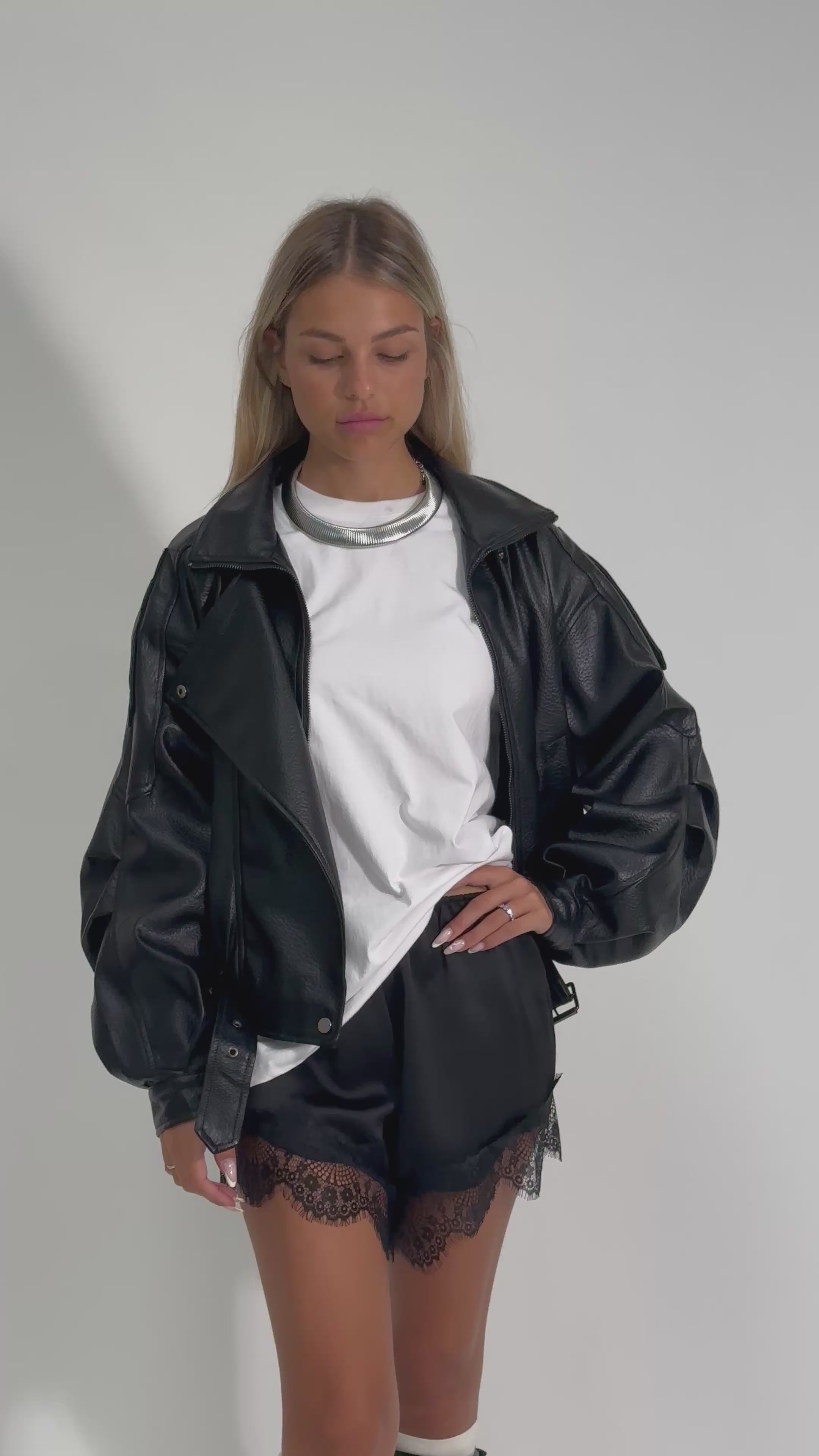 Giacca modello bomber foderata in eco pelle martellata con chiusura a zip, manica drappeggiata, tasche laterali e fondo ad elastico.