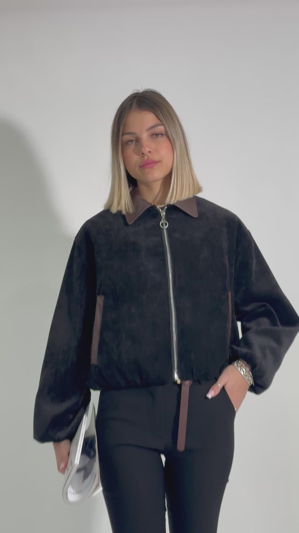 Giacca bomber in velluto liscio foderata, tasche laterali con profili in ecopelle e chiusura a zip.