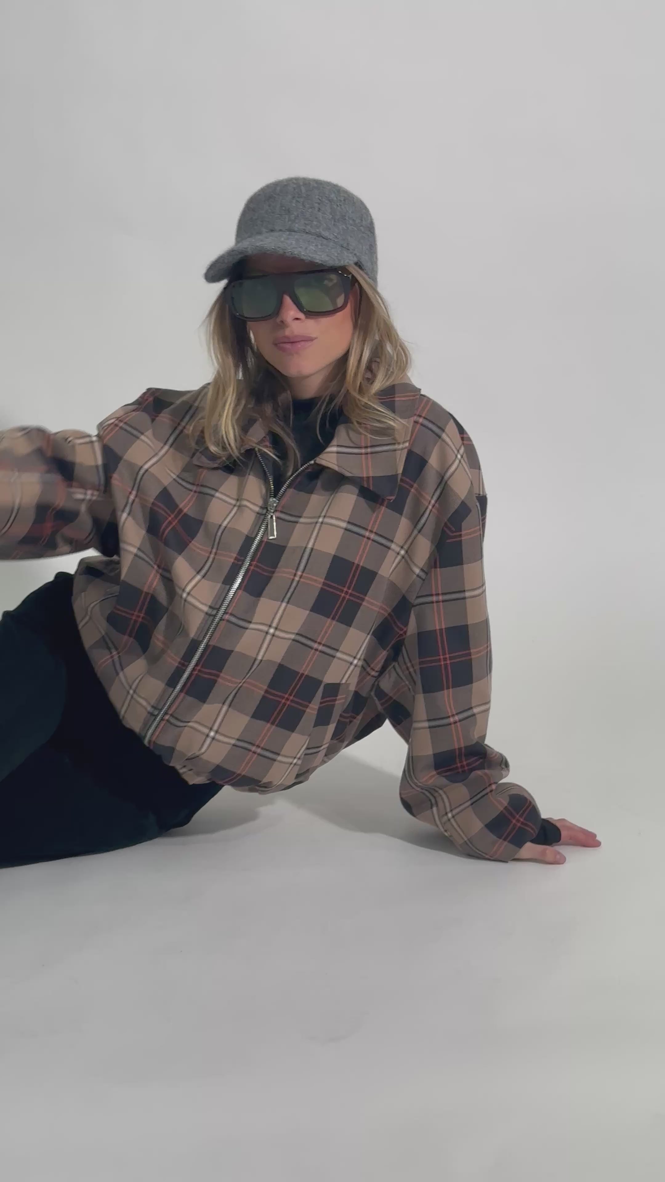 Giacca bomber tessuto madras, foderata con tasche laterali e chiusura a zip.