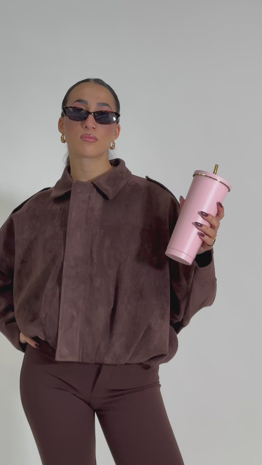 Giacca modello bomber dal taglio over, foderato effetto eco renna con chiusura a zip.