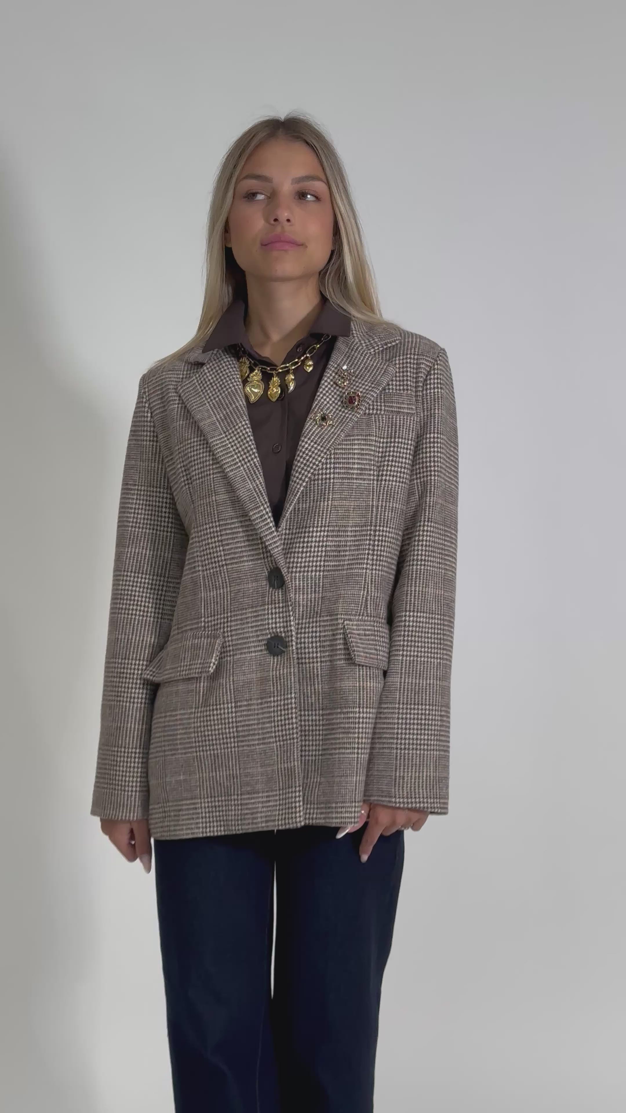 Giacca dritta a mono petto foderata con spalline rinforzate, finte tasche e dettaglio spille removibili.