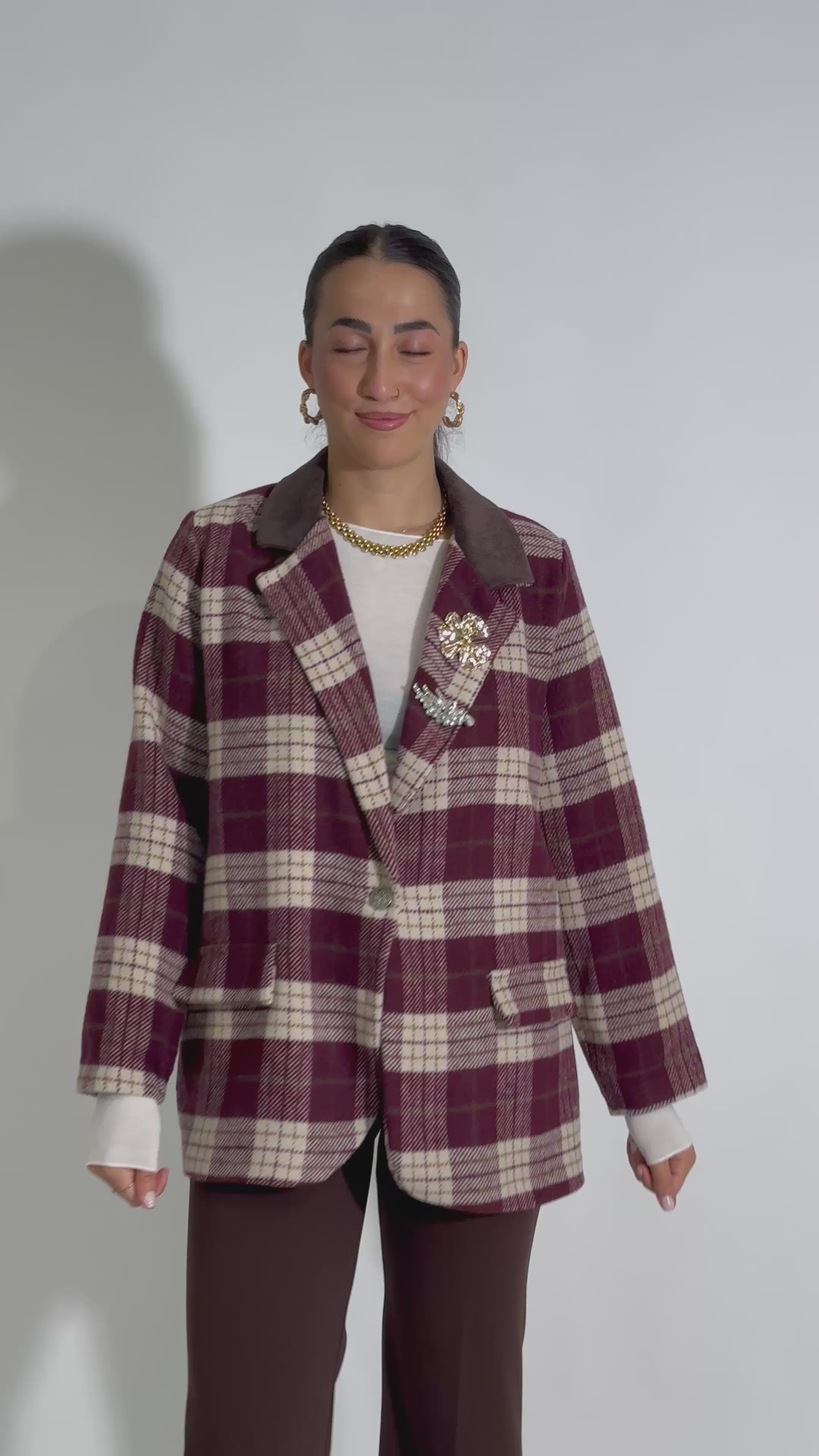 Giacca Check monopetto foderata in panno dal taglio dritto con spalline rinforzate. Colletto a contrasto a costine e spille removibili.