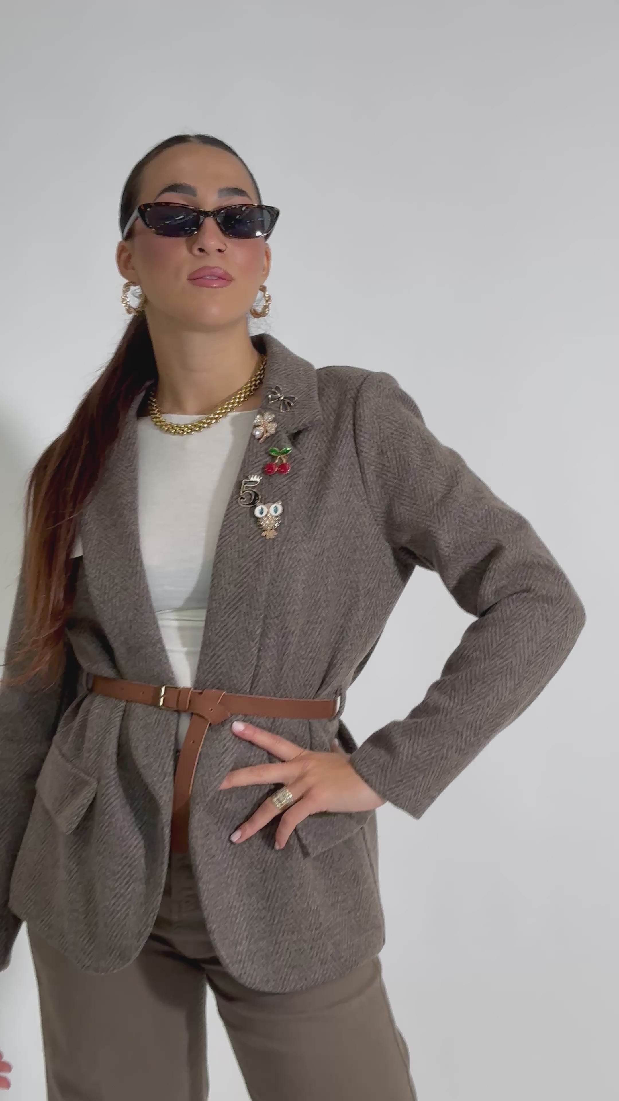 Giacca foderata in panno con tasche a patta, spalline rinforzate e cintura inclusa. Spille removibili. Veste fino a tg 46