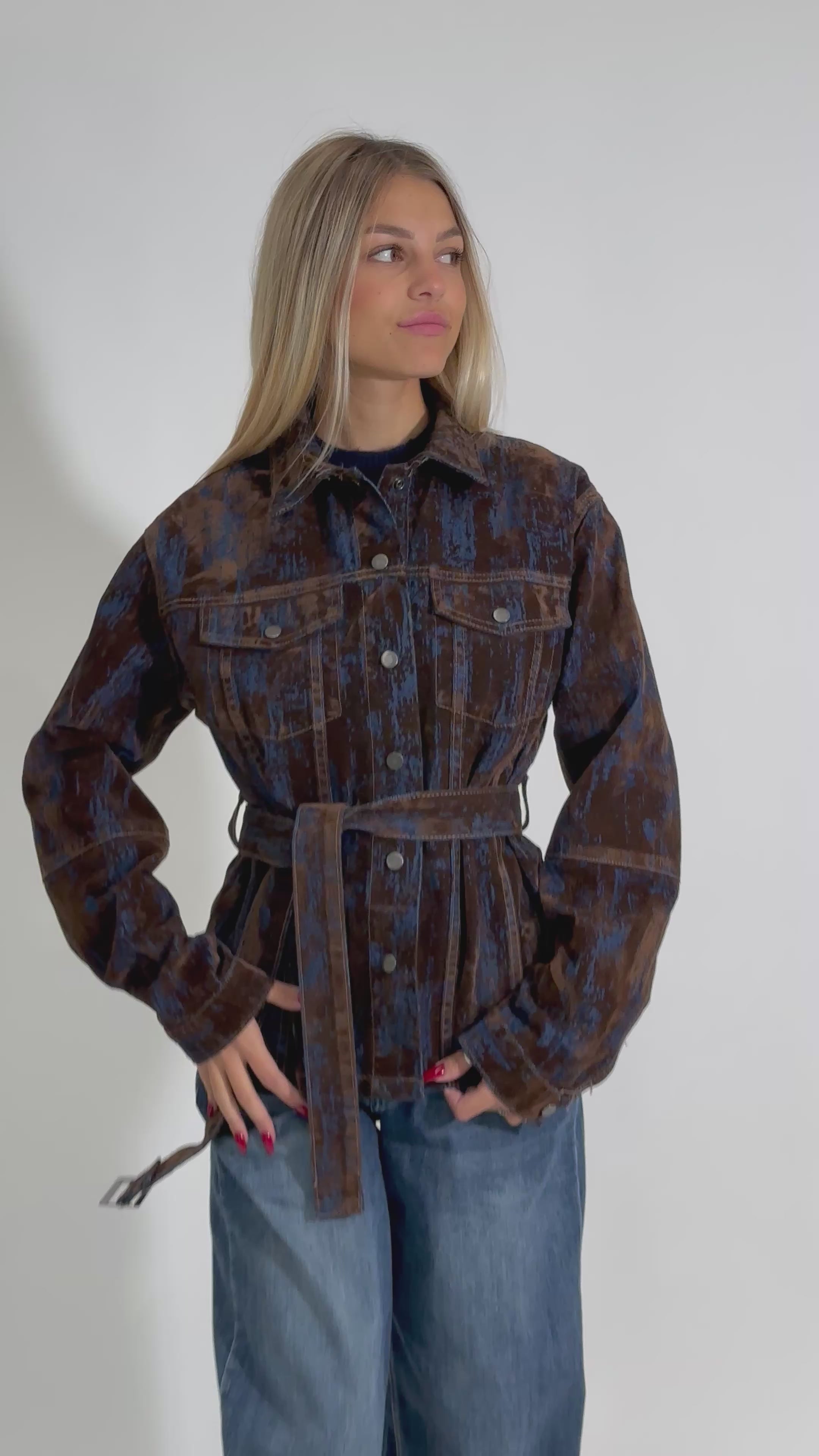 Giacca in denim con striature in velluto chiusura a bottoni automatici, tasche a patta frontali e cintura.