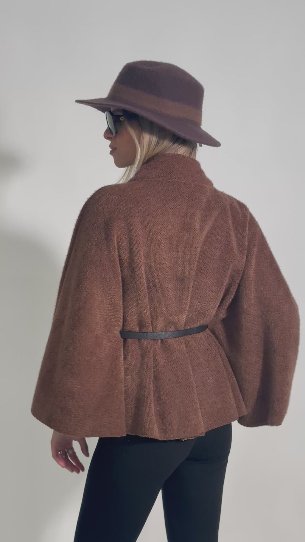 Mantella fluffy con chiusura a bottone e dettaglio cintura sul punto vita.