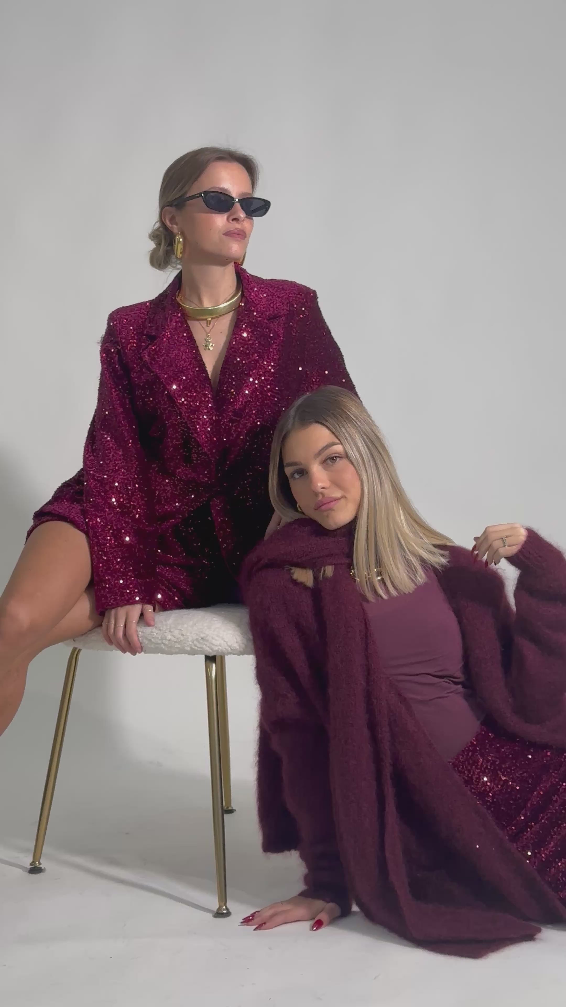 Giacca monopetto foderata in velluto con micro paillettes e spalline rinforzate.