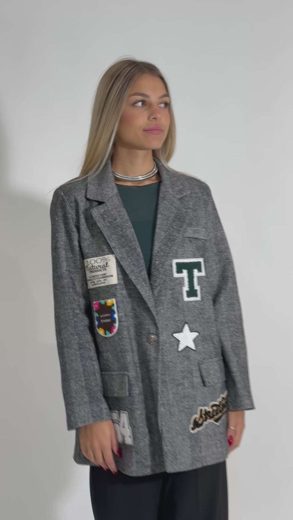 Giacca monopetto foderata in panno dal taglio dritto e patch applicati.