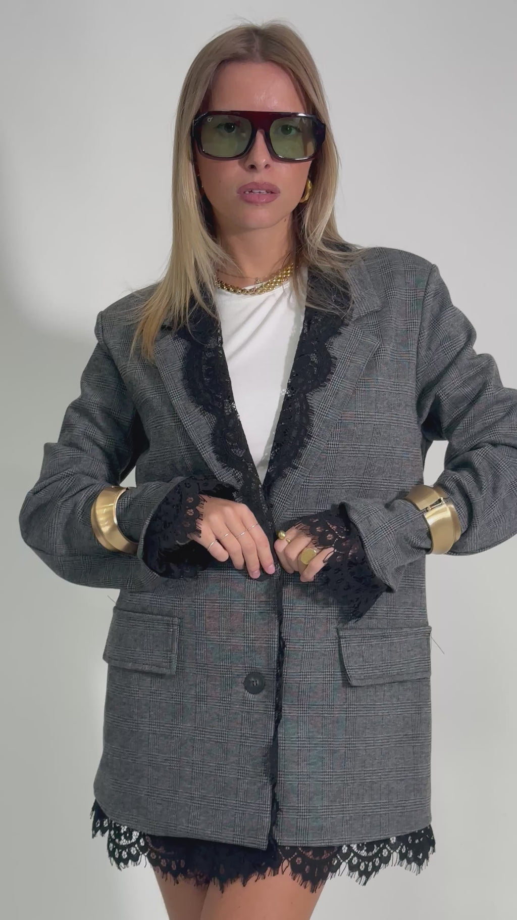 Giacca monopetto foderata dal taglio dritto con inserti in pizzo e tasche a patta.