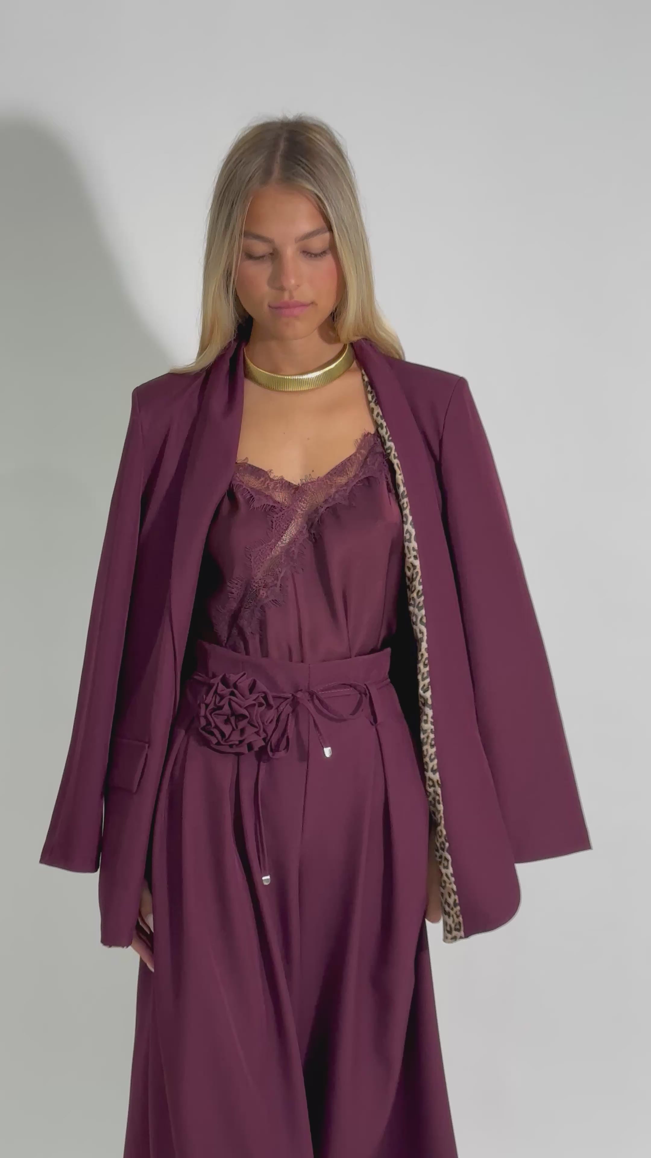 Giacca aperta con collo reverse, fodera interna maculata, spalline rinforzate e finte tasche a patta.
