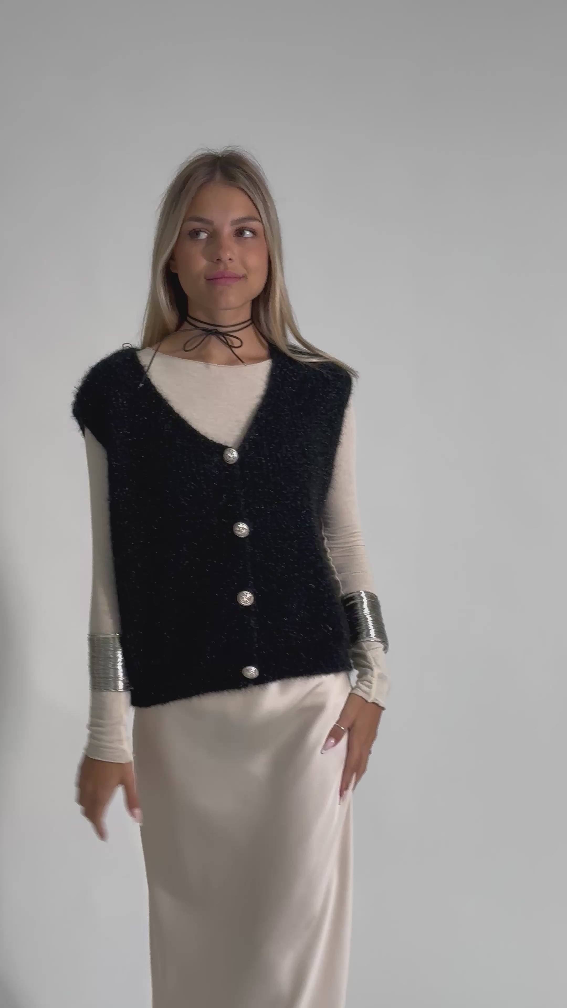 Gilet effetto mohair con filo in lurex e chiusura a bottoni gioiello.