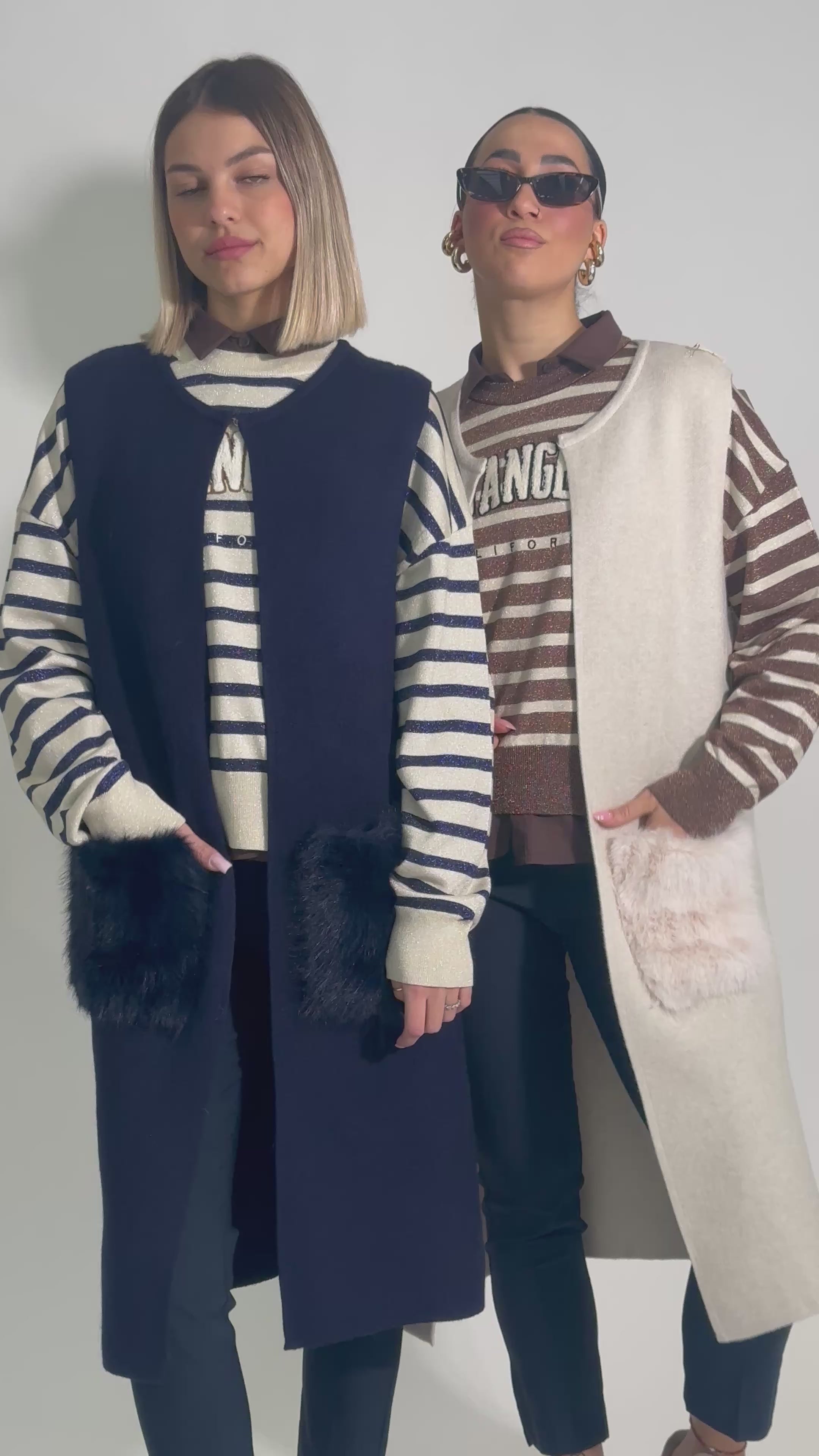Gilet lungo in maglia con tasche in eco pelliccia e chiusura gancio.