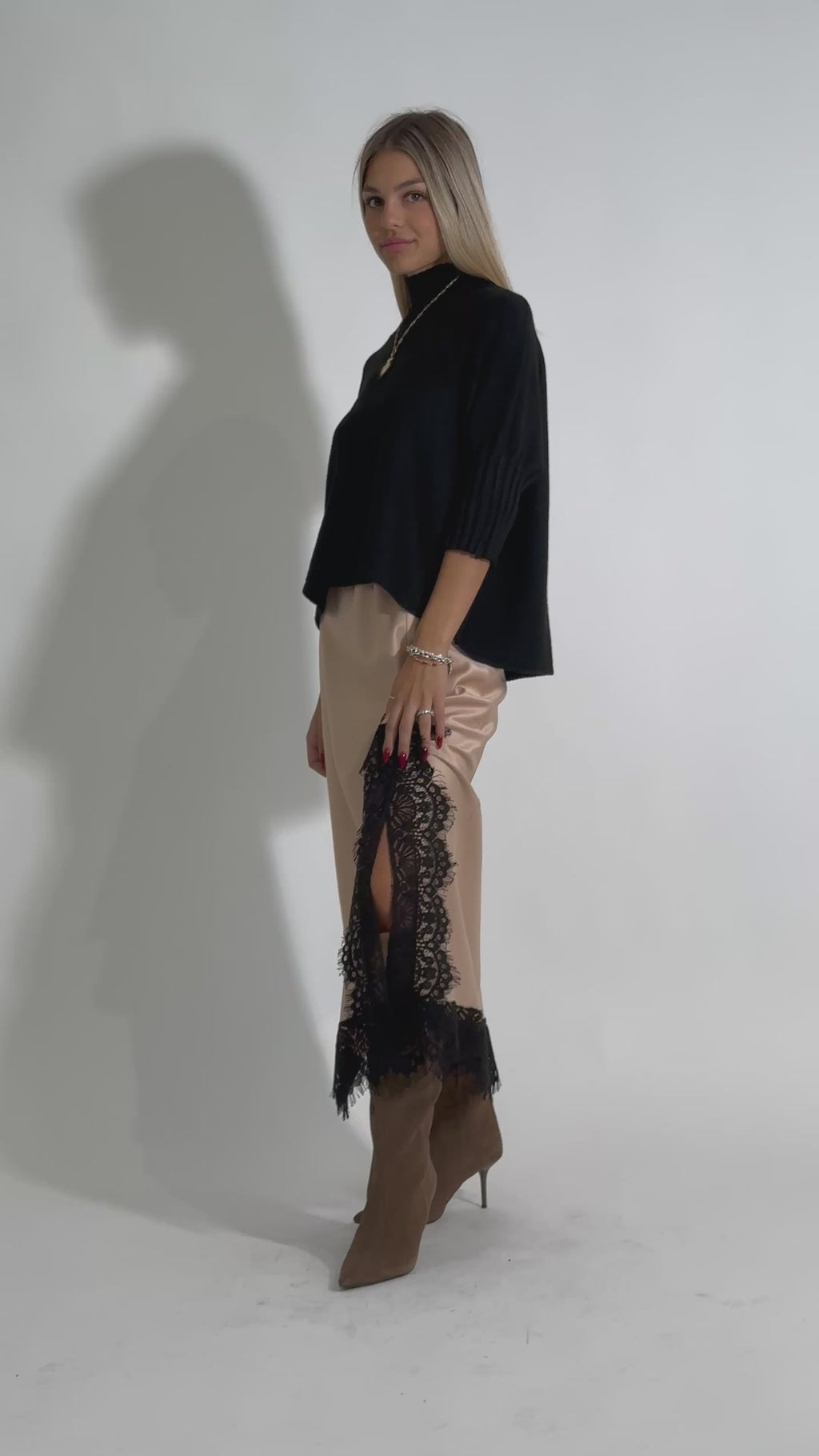 Gonna longuette in doppio raso con spacco, profilo in pizzo e vita elastica.