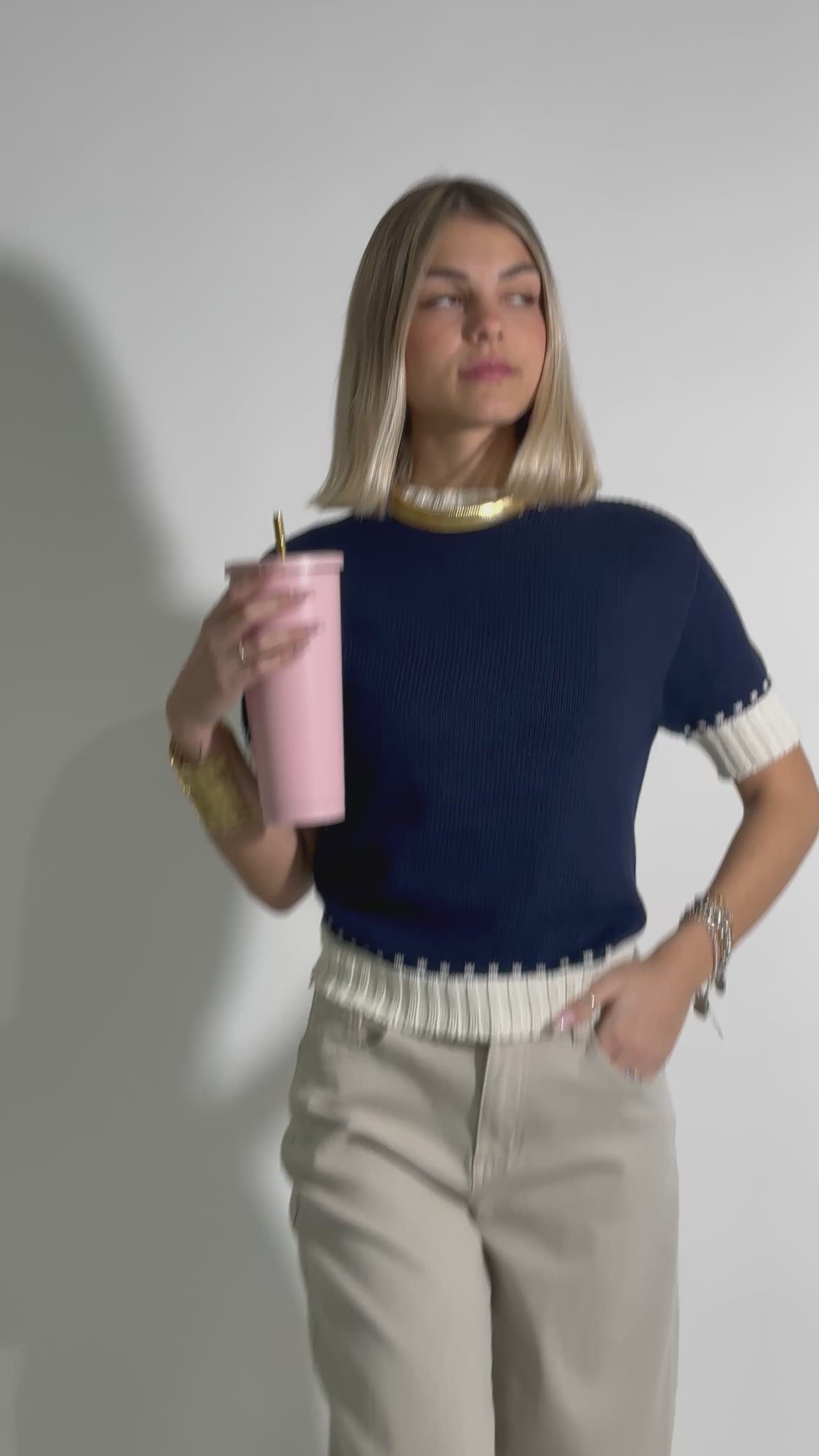 Pantalone in cotone effetto baloon slim, cinque tasche, elasticizzato, vita medio alta e vestibilità comfort.
