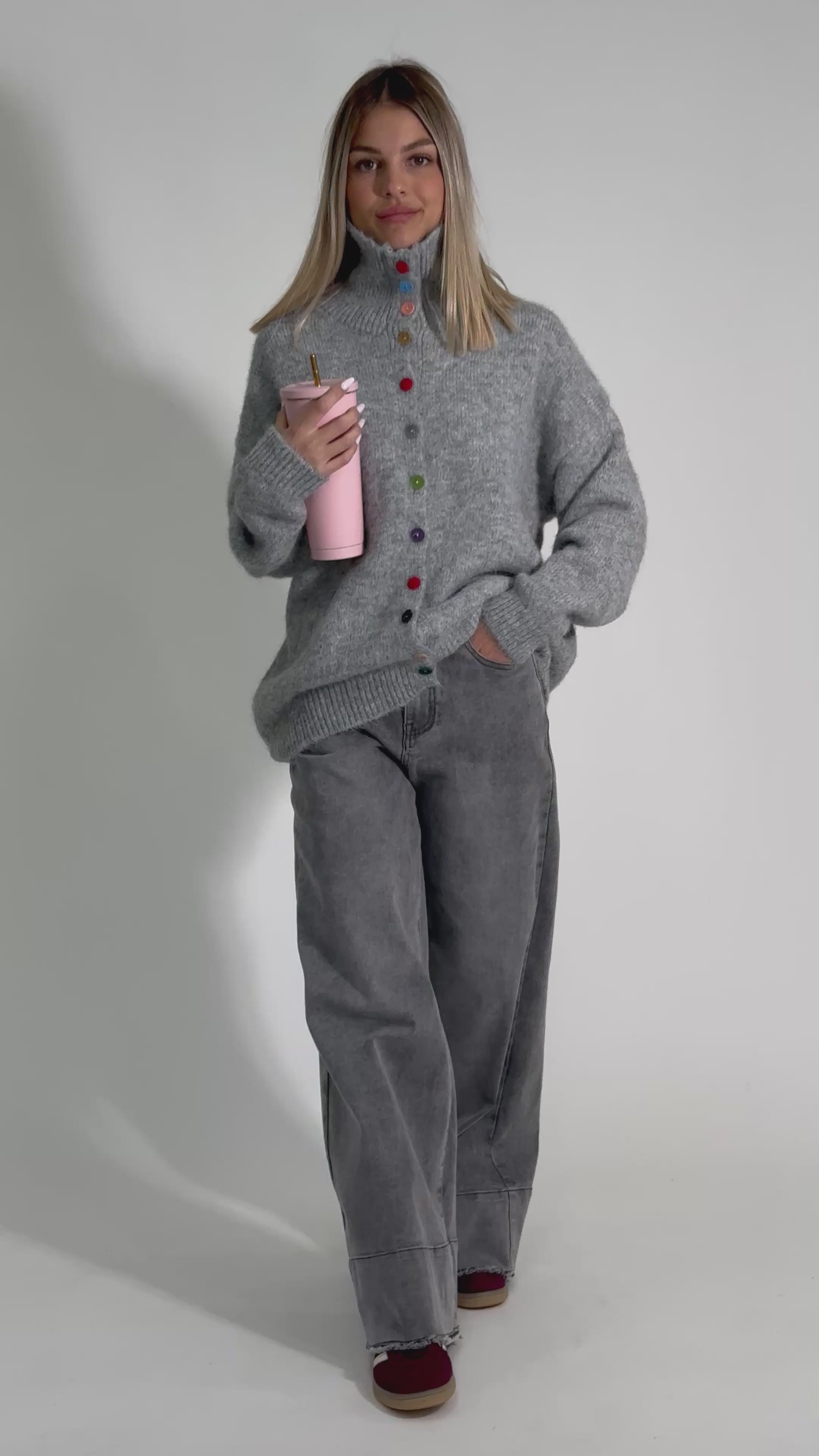 Jeans 5 tasche a palazzo elasticizzato con vita media e risvolto sfrangiato.