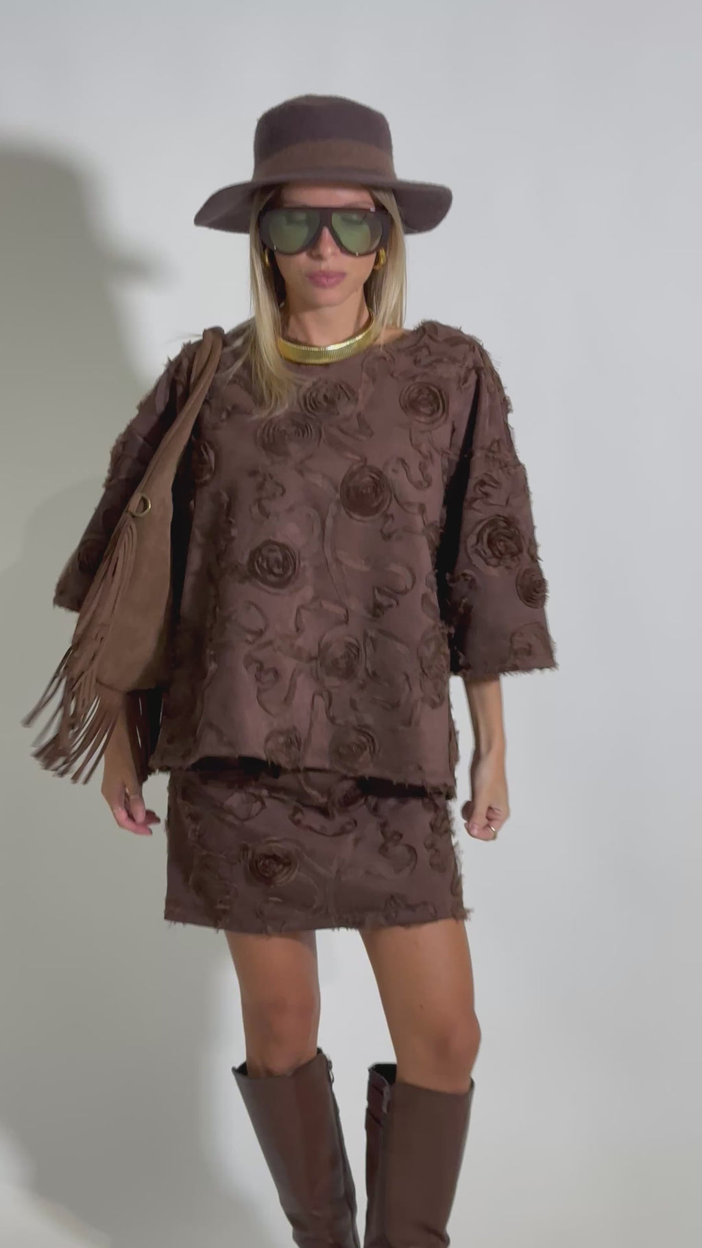 Maglia scatoletta con manica 3/4 effetto scamosciato con ricami in rilievo e chiusura zip posteriore.