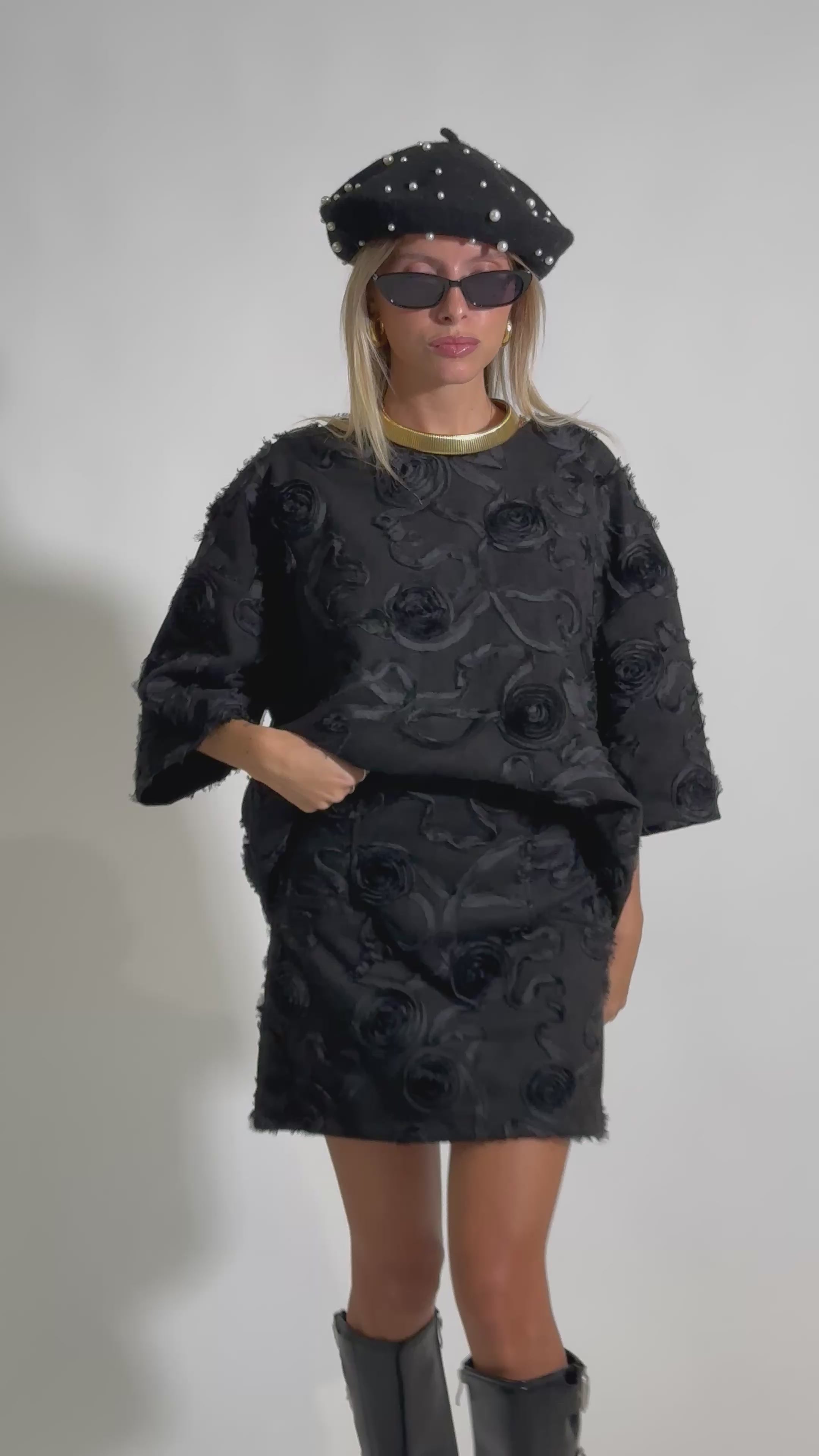 Maglia scatoletta con manica 3/4 effetto scamosciato con ricami in rilievo e chiusura zip posteriore.