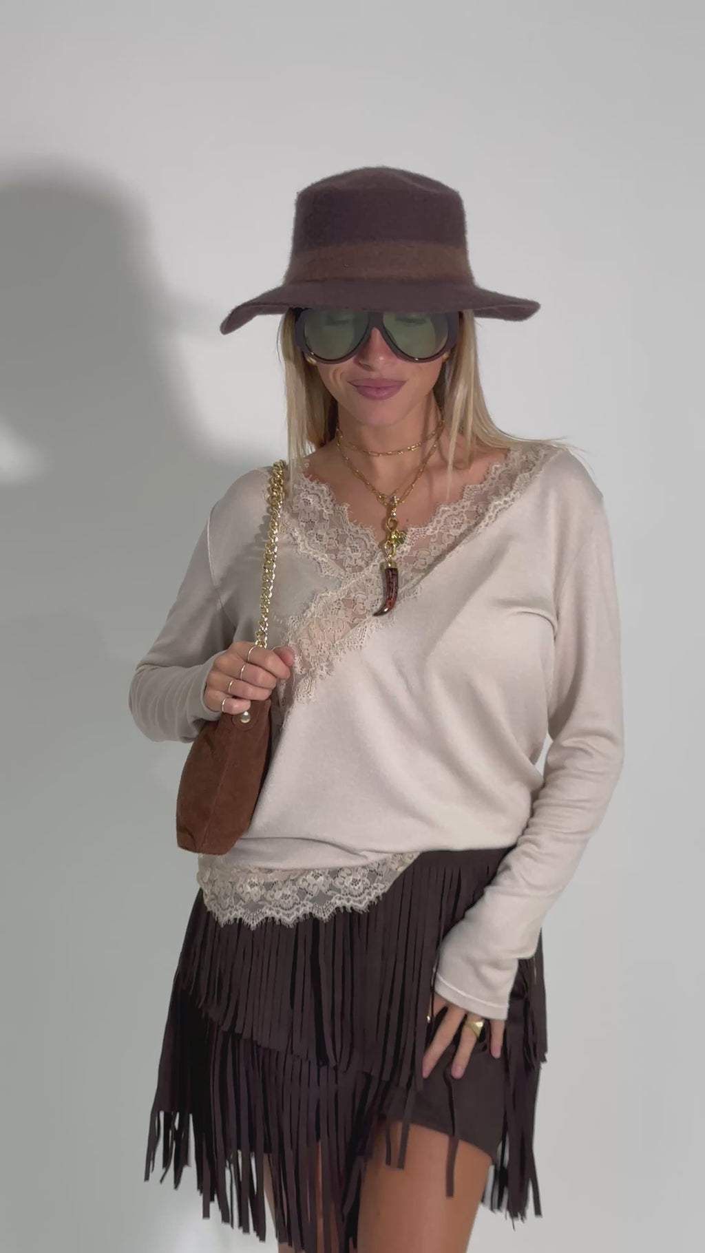 Maglia in misto viscosa a scollo a V con profili e rifiniture in pizzo.