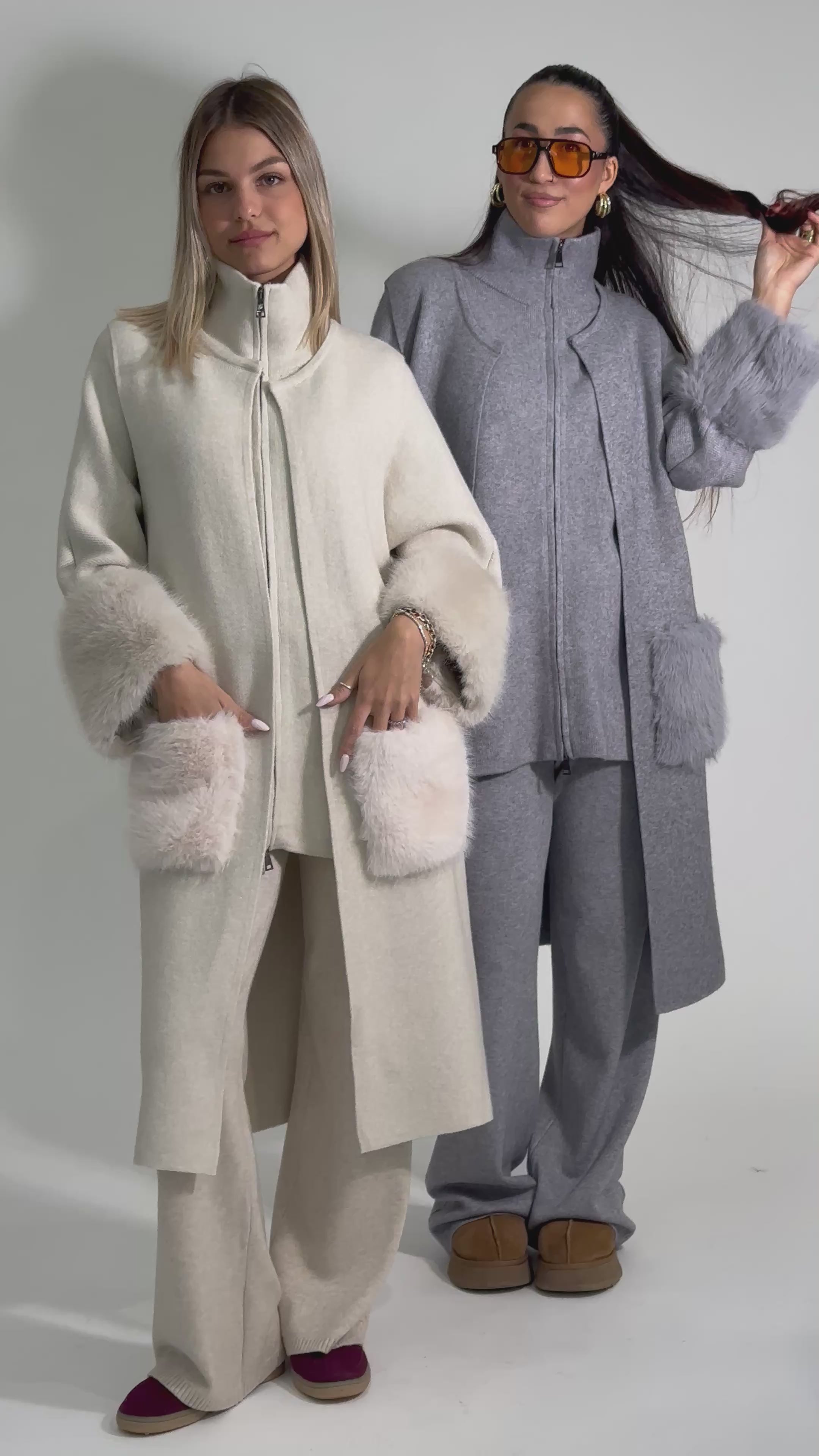 Maglia/cardigan dal taglio dritto in misto viscosa con chiusura a zip, tasche laterali e dettaglio polsi in eco pelliccia.