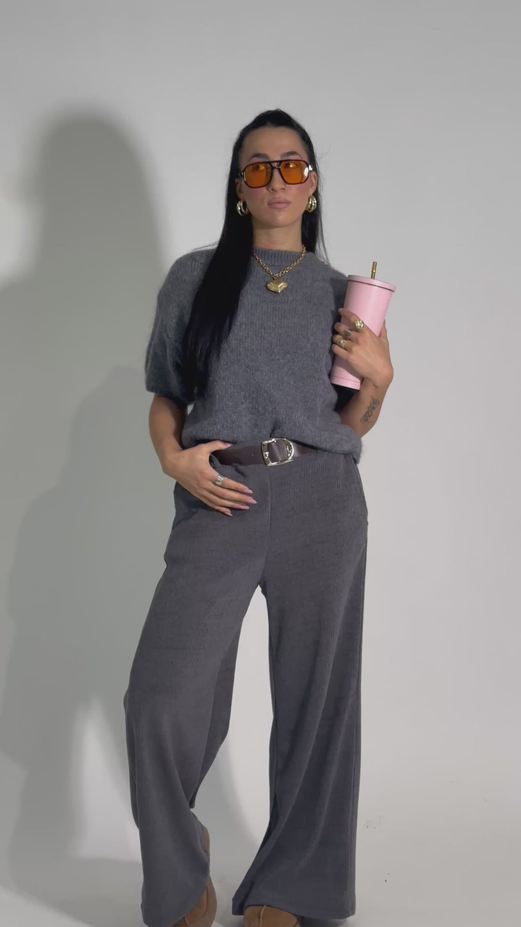 Pantalone palazzo a costina di velluto con vita elastica, tasche laterali e cintura.