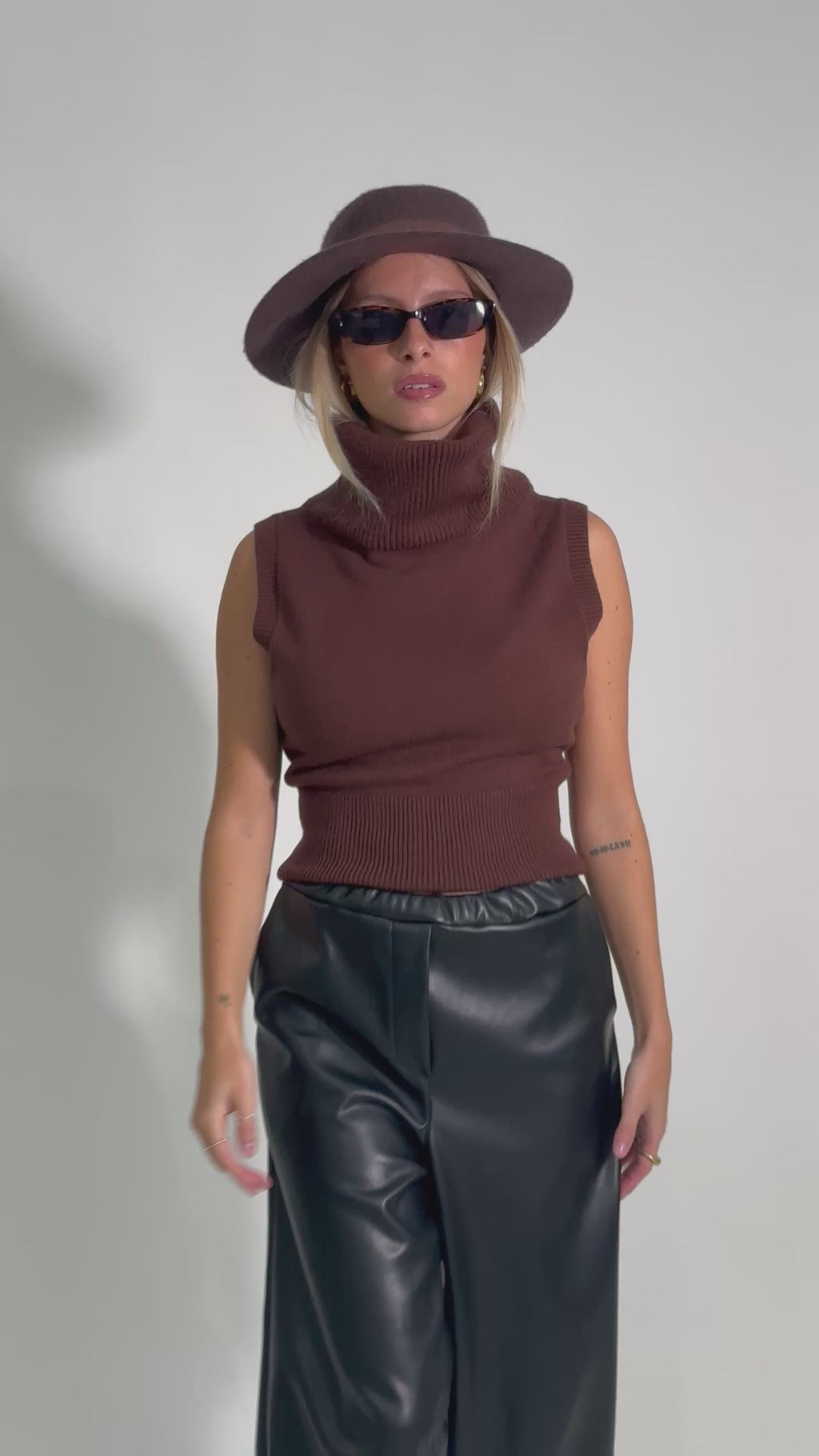Pantalone ecopelle baggy con vita elastica, tasche laterali e dettaglio cucitura.