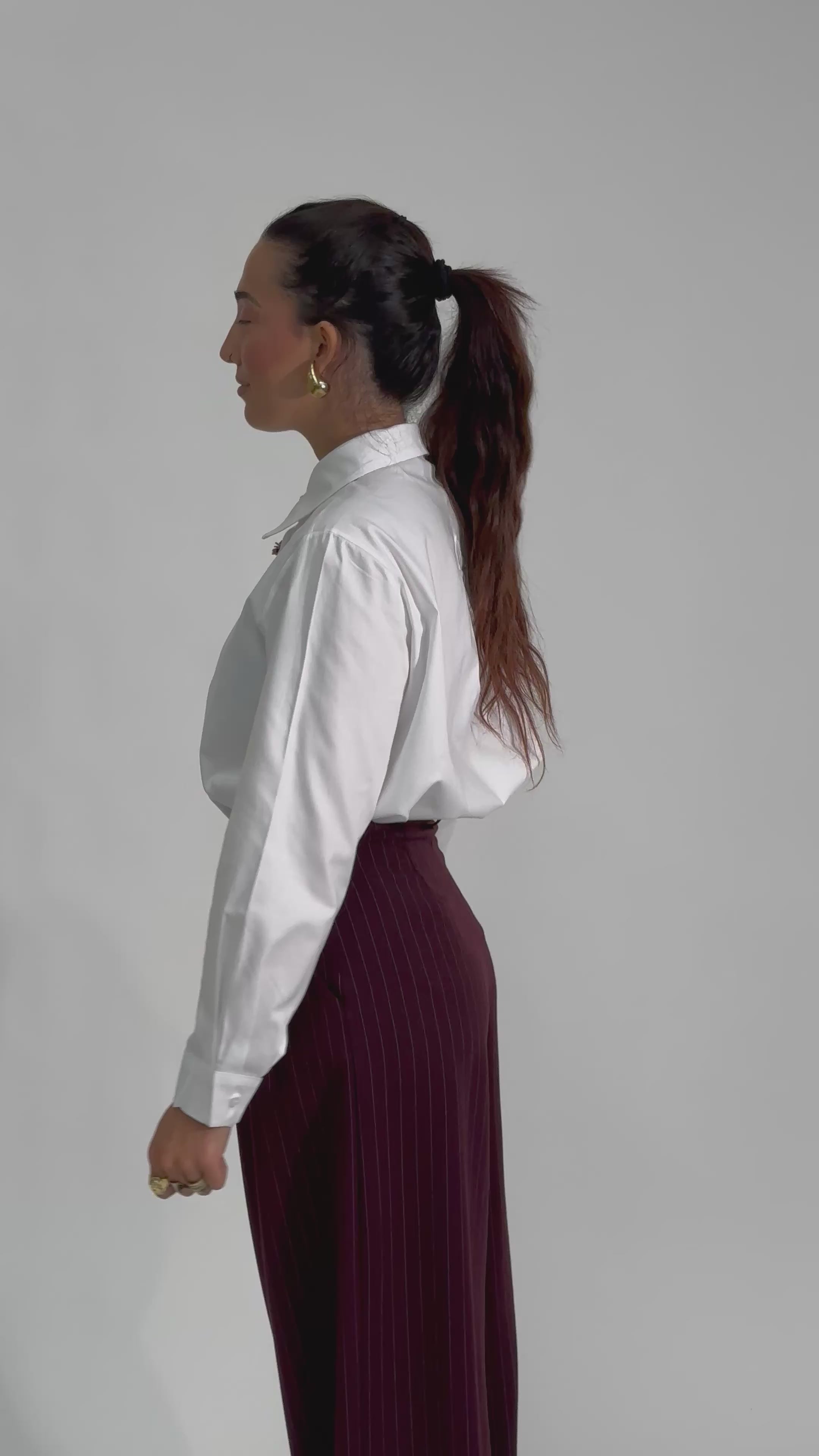 Pantalone a palazzo a trama gessata con pinces, vita medio alta e tasche laterali.