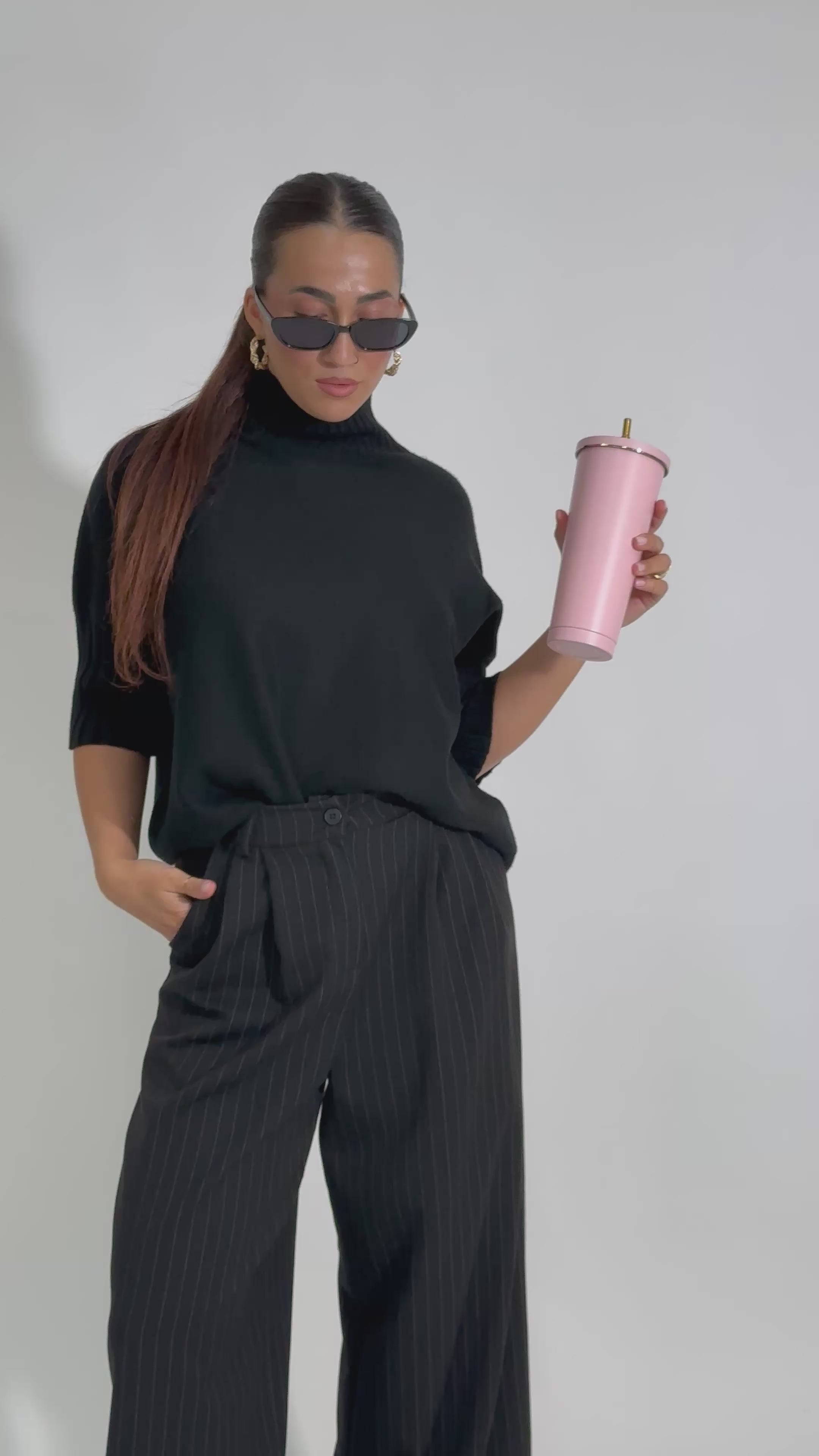 Pantalone a palazzo a trama gessata con pinces, vita medio alta e tasche laterali.